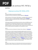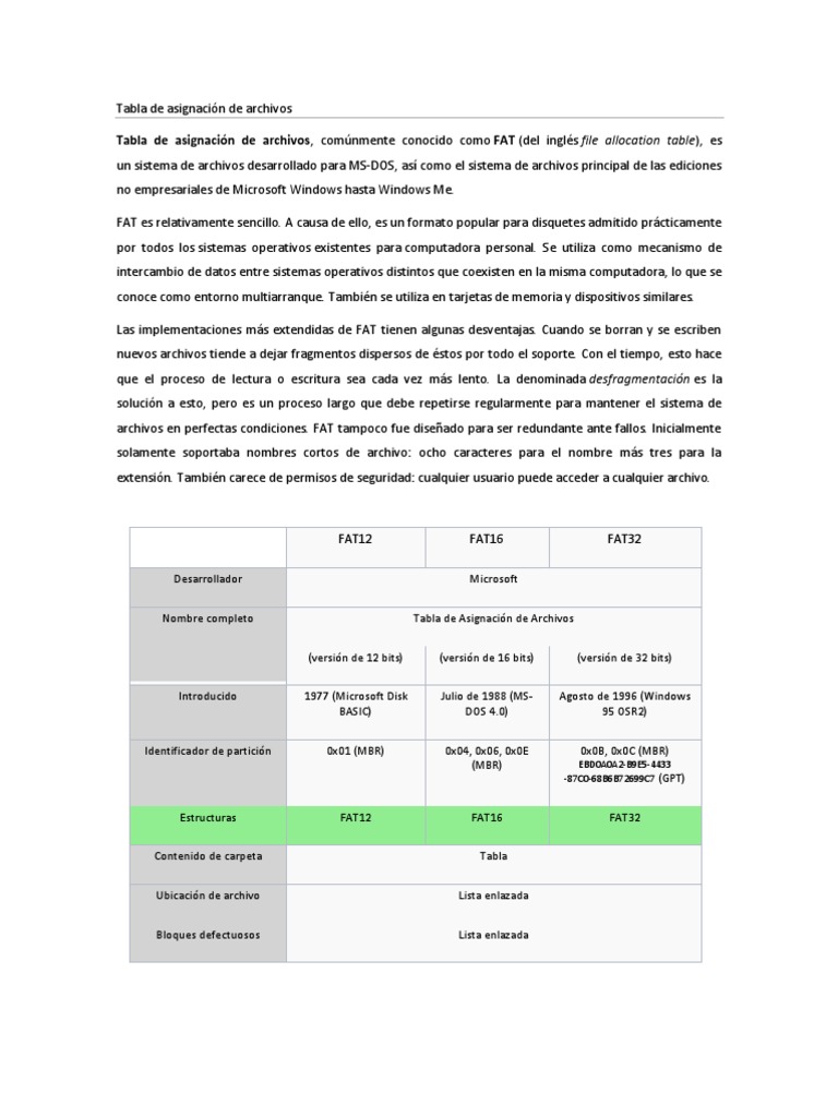 es un sistema de archivos desarrollado para MS-DOS, as como el sistema de archivos principal de las ediciones no empresariales de Microsoft Windows hasta Windows Me. FAT es relativamente sencillo. A causa de ello, es un formato popular para disquetes admitido prcticamente por todos los sistemas operativos existentes para computadora personal. Se utiliza como mecanismo de intercambio de datos entre sistemas operativos distintos que coexisten en la misma computadora, lo que se conoce como entorno multiarranque. Tambin se utiliza en tarjetas de memoria y dispositivos similares. Las implementaciones ms extendidas de FAT tienen algunas desventajas. Cuando se borran y se escriben nuevos archivos tiende a dejar fragmentos dispersos de stos por todo el soporte. Con el tiempo, esto hace que el proceso de lectura o escritura sea cada vez ms lento. La denominada desfragmentacin es la solucin a esto, pero es un proceso largo que debe repetirse regularmente para mantener el sistema de archivos en perfectas condiciones. FAT tampoco fue diseado para ser redundante ante fallos. Inicialmente solamente soportaba nombres cortos de archivo: ocho caracteres para el nombre ms tres para la extensin. Tambin carece de permisos de seguridad: cualquier usuario puede acceder a cualquier archivo.