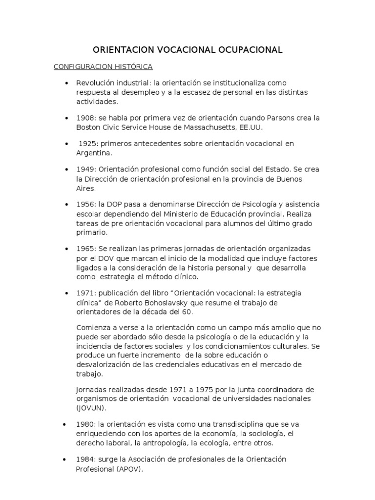 CONFIGURACION HISTRICA Revolucin industrial: la orientacin se institucionaliza como respuesta al desempleo y a la escasez de personal en las distintas actividades. 1908: se habla por primera vez de orientacin cuando Parsons crea la Boston Civic Service House de Massachusetts, EE.UU. 1925: primeros antecedentes sobre orientacin vocacional en Argentina. 1949: Orientacin profesional como funcin social del Estado. Se crea la Direccin de orientacin profesional en la provincia de Buenos Aires. 1956: la DOP pasa a denominarse Direccin de Psicologa y asistencia escolar dependiendo del Ministerio de Educacin provincial. Realiza tareas de pre orientacin vocacional para alumnos del ltimo grado primario. 1965: Se realizan las primeras jornadas de orientacin organizadas por el DOV que marcan el inicio de la modalidad que incluye factores ligados a la consideracin de la historia personal y que desarrolla como estrategia el mtodo clnico. 1971: publicacin del libro Orientacin vocacional: la estrategia clnica de Roberto Bohoslavsky que resume el trabajo de orientadores de la dcada del 60. Comienza a verse a la orientacin como un campo ms amplio que no puede ser abordado slo desde la psicologa o de la educacin y la incidencia de factores sociales y los condicionamientos culturales. Se produce un fuerte incremento de la sobre educacin o desvalorizacin de las credenciales educativas en el mercado de trabajo. Jornadas realizadas desde 1971 a 1975 por la Junta coordinadora de organismos de orientacin vocacional de universidades nacionales (JOVUN). 1980: la orientacin es vista como una transdisciplina que se va enriqueciendo con los aportes de la economa, la sociologa, el derecho laboral, la antropologa, la ecologa, entre otros. 1984: surge la Asociacin de profesionales de la Orientacin Profesional (APOV).