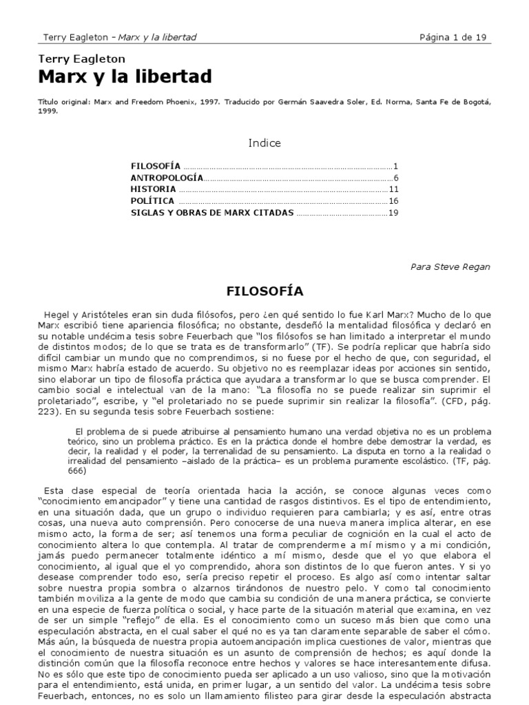 Terry Eagleton - Marx y la libertad Pgina 3 de 19 sus miembros se retiren de las demandas del trabajo productivo para convertirse en polticos, acadmicos, promotores culturales, etc., de tiempo completo, y es en ese momento cuando la filosofa alcanza su plenitud. Ahora, el pensamiento puede fantasear acerca de su independencia de la realidad material, justamente porque existe un sentido material en que realmente es independiente: