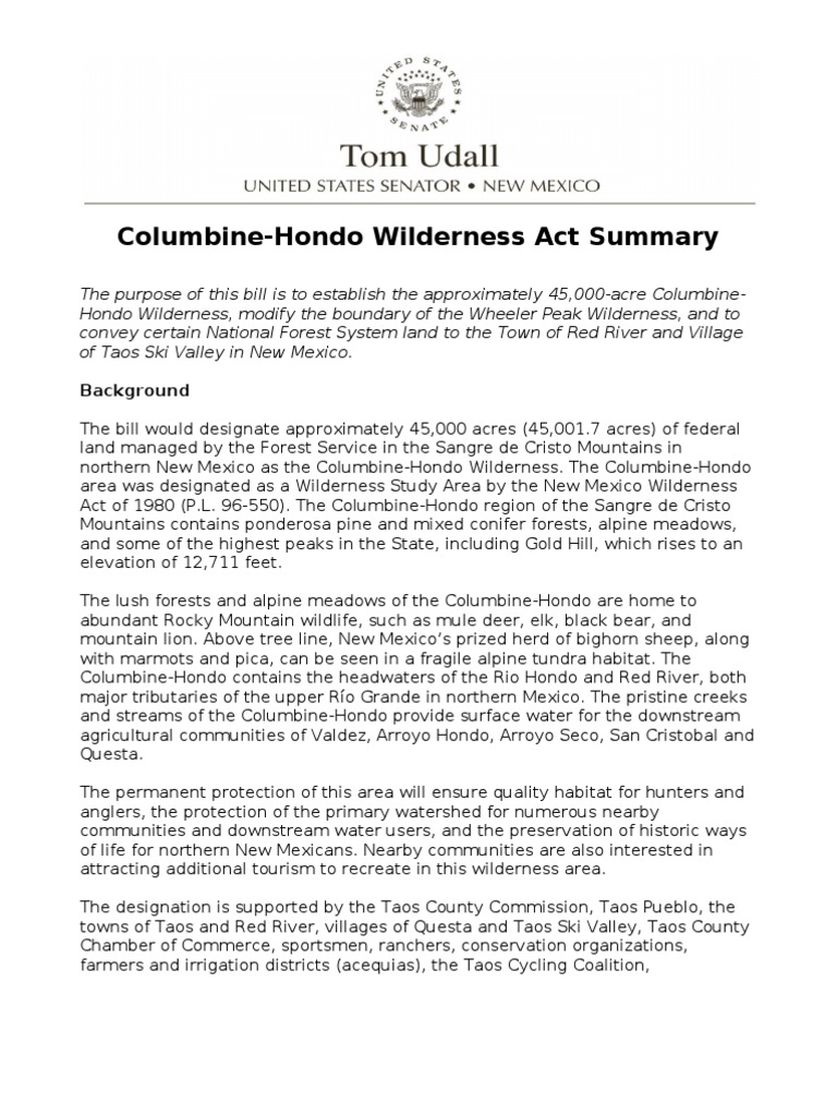 The bill would designate approximately 45,000 acres (45,001.7 acres) of federalland managed by the Forest Service in the Sangre de Cristo Mountains innorthern New Mexico as the Columbine-Hondo Wilderness. The Columbine-Hondoarea was designated as a Wilderness Study Area by the New Mexico WildernessAct of 1980 (P.L. 96-550). The Columbine-Hondo region of the Sangre de CristoMountains contains ponderosa pine and mixed conifer forests, alpine meadows,and some of the highest peaks in the State, including Gold Hill, which rises to anelevation of 12,711 feet. The lush forests and alpine meadows of the Columbine-Hondo are home toabundant Rocky Mountain wildlife, such as mule deer, elk, black bear, andmountain lion. Above tree line, New Mexico’s prized herd of bighorn sheep, alongwith marmots and pica, can be seen in a fragile alpine tundra habitat. TheColumbine-Hondo contains the headwaters of the Rio Hondo and Red River, bothmajor tributaries of the upper Río Grande in northern Mexico. The pristine creeksand streams of the Columbine-Hondo provide surface water for the downstreamagricultural communities of Valdez, Arroyo Hondo, Arroyo Seco, San Cristobal andQuesta. The permanent protection of this area will ensure quality habitat for hunters andanglers, the protection of the primary watershed for numerous nearbycommunities and downstream water users, and the preservation of historic waysof life for northern New Mexicans. Nearby communities are also interested inattracting additional tourism to recreate in this wilderness area. The designation is supported by the Taos County Commission, Taos Pueblo, thetowns of Taos and Red River, villages of Questa and Taos Ski Valley, Taos CountyChamber of Commerce, sportsmen, ranchers, conservation organizations,farmers and irrigation districts (acequias), the Taos Cycling Coalition,