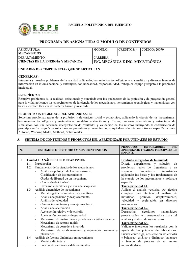 UNIDADES DE COMPETENCIAS QUE SE ARTICULAN GENRICAS: Interpreta y resuelve problemas de la realidad aplicando, herramientas tecnolgicas y matemticas y diversas fuentes de informacin en idioma nacional y extranjero, con honestidad, responsabilidad, trabajo en equipo y respeto a la propiedad intelectual. ESPECFICAS: Resuelve problemas de la realidad, relacionada y vinculada con los quehaceres de la profesin y de proyeccin general para la vida; aplicando los conocimientos de la ciencia de los mecanismos, herramientas tecnolgicas y matemticas con bases cientfico tcnicas de carcter bsico y avanzada. PRODUCTO INTEGRADOR DEL APRENDIZAJE: Soluciona problemas reales de la profesin y de carcter social y econmico, aplicando la ciencia de los mecanismos, herramientas tecnolgicas y matemticas, modelos matemticos y fsicos, procesos estocsticos y estructuras de simulacin con una adecuada interpretacin de resultados y validacin de los mismos incluyendo la construccin de prototipos en la mayora de soluciones empresariales y comunitarias; apoyndose adems con software especfico como, Autocad, Working Model, Mathcad, Solid Works. A. N. 1 SISTEMA DE CONTENIDOS Y PRODUCTOS DEL APRENDIZAJE POR UNIDADES DE ESTUDIO UNIDADES DE ESTUDIO Y SUS CONTENIDOS Unidad 1: ANLISIS DE MECANISMOS 1.1 Introduccin 1.2 Fundamentos de la ciencia de los mecanismos. - Anlisis topolgico de los mecanismos - Clasificacin de los mecanismos - Grados de libertad de un mecanismo - Condicin de Grashof - Inversin cinemtica y curvas de acoplador 1.3 Anlisis cinemtico de mecanismos - Mtodos grficos, numricos y analticos - Anlisis de posicin y desplazamiento - Anlisis de velocidad - Centros instantneos y ventaja mecnica - Anlisis de aceleracin - Aceleracin relativa y de coriolis - Aceleracin de centros de gravedad - Mecanismo de cuatro barras y cadena cinemtica en serie - Mecanismo de retorno rpido - Mecanismo de corredera invertida - Mecanismo de eslabonamiento y engranajes comunes y planetarios 1.4 Anlisis de fuerzas dinmicas en mecanismos - Modelos dinmicos - Fuerzas de inercia en eslabonamientos