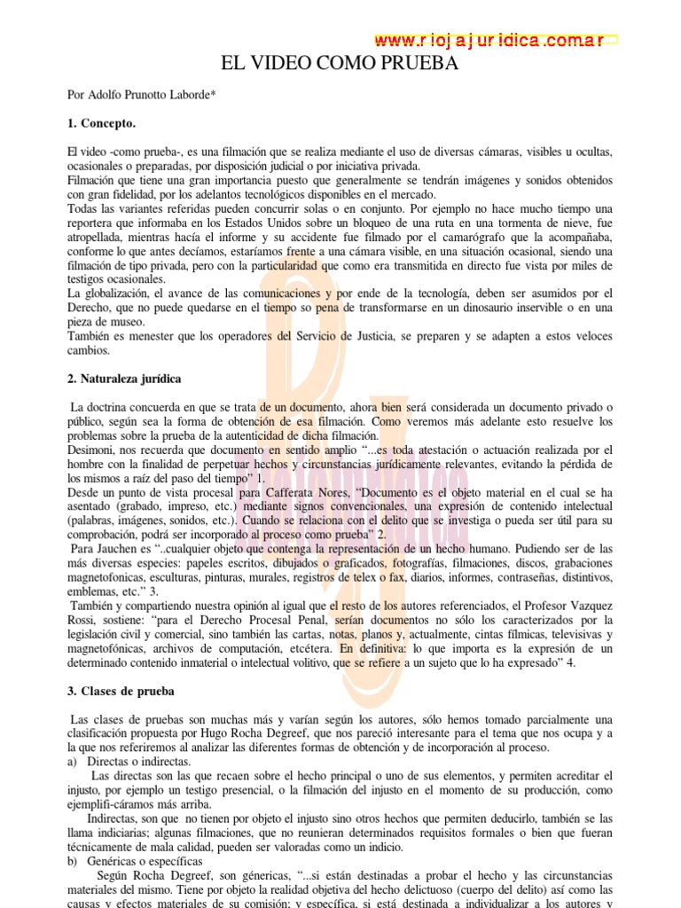 Por Adolfo Prunotto Laborde* 1. Concepto. El video -como prueba-, es una filmacin que se realiza mediante el uso de diversas cmaras, visibles u ocultas, ocasionales o preparadas, por disposicin judicial o por iniciativa privada. Filmacin que tiene una gran importancia puesto que generalmente se tendrn imgenes y sonidos obtenidos con gran fidelidad, por los adelantos tecnolgicos disponibles en el mercado. Todas las variantes referidas pueden concurrir solas o en conjunto. Por ejemplo no hace mucho tiempo una reportera que informaba en los Estados Unidos sobre un bloqueo de una ruta en una tormenta de nieve, fue atropellada, mientras haca el informe y su accidente fue filmado por el camargrafo que la acompaaba, conforme lo que antes decamos, estaramos frente a una cmara visible, en una situacin ocasional, siendo una filmacin de tipo privada, pero con la particularidad que como era transmitida en directo fue vista por miles de testigos ocasionales. La globalizacin, el avance de las comunicaciones y por ende de la tecnologa, deben ser asumidos por el Derecho, que no puede quedarse en el tiempo so pena de transformarse en un dinosaurio inservible o en una pieza de museo. Tambin es menester que los operadores del Servicio de Justicia, se preparen y se adapten a estos veloces cambios. 2. Naturaleza jurdica La doctrina concuerda en que se trata de un documento, ahora bien ser considerada un documento privado o pblico, segn sea la forma de obtencin de esa filmacin. Como veremos ms adelante esto resuelve los problemas sobre la prueba de la autenticidad de dicha filmacin. Desimoni, nos recuerda que documento en sentido amplio ...es toda atestacin o actuacin realizada por el hombre con la finalidad de perpetuar hechos y circunstancias jurdicamente relevantes, evitando la prdida de los mismos a raz del paso del tiempo 1. Desde un punto de vista procesal para Cafferata Nores, Documento es el objeto material en el cual se ha asentado (grabado, impreso, etc.) mediante signos convencionales, una expresin de contenido intelectual (palabras, imgenes, sonidos, etc.). Cuando se relaciona con el delito que se investiga o pueda ser til para su comprobacin, podr ser incorporado al proceso como prueba 2. Para Jauchen es ..cualquier objeto que contenga la representacin de un hecho humano. Pudiendo ser de las ms diversas especies: papeles escritos, dibujados o graficados, fotografas, filmaciones, discos, grabaciones magnetofonicas, esculturas, pinturas, murales, registros de telex o fax, diarios, informes, contraseas, distintivos, emblemas, etc. 3. Tambin y compartiendo nuestra opinin al igual que el resto de los autores referenciados, el Profesor Vazquez Rossi, sostiene: para el Derecho Procesal Penal, seran documentos no slo los caracterizados por la legislacin civil y comercial, sino tambin las cartas, notas, planos y, actualmente, cintas flmicas, televisivas y magnetofnicas, archivos de computacin, etctera. En definitiva: lo que importa es la expresin de un determinado contenido inmaterial o intelectual volitivo, que se refiere a un sujeto que lo ha expresado 4. 3. Clases de prueba Las clases de pruebas son muchas ms y varan segn los autores, slo hemos tomado parcialmente una clasificacin propuesta por Hugo Rocha Degreef, que nos pareci interesante para el tema que nos ocupa y a la que nos referiremos al analizar las diferentes formas de obtencin y de incorporacin al proceso. a) Directas o indirectas. Las directas son las que recaen sobre el hecho principal o uno de sus elementos, y permiten acreditar el injusto, por ejemplo un testigo presencial, o la filmacin del injusto en el momento de su produccin, como ejemplifi-cramos ms arriba. Indirectas, son que no tienen por objeto el injusto sino otros hechos que permiten deducirlo, tambin se las llama indiciarias; algunas filmaciones, que no reunieran determinados requisitos formales o bien que fueran tcnicamente de mala calidad, pueden ser valoradas como un indicio. b) Genricas o especficas Segn Rocha Degreef, son gnericas, ...si estn destinadas a probar el hecho y las circunstancias materiales del mismo. Tiene por objeto la realidad objetiva del hecho delictuoso (cuerpo del delito) as como las causas y efectos materiales de su comisin; y especfica, si est destinada a individualizar a los autores y sealar la responsabilidad penal en que ha incurrido cada uno de ellos 5. Depende del tipo de filmacin de que se trate, puede participar de una o las dos caractersticas, por ejemplo la filmacin del asalto a un banco por las cmaras de seguridad, cumplir los fines de ambas; permitir probar el hecho e individualizar a sus autores. c) Perfectas o imperfectas Perfecta o plena, es la que acredita en forma completa e indubitable el injusto que se investiga, volvemos a dar el ejemplo del banco. Imperfecta o semiplena, es la que no satisface en su totalidad la ntima conviccin del juzgador (principio de la sana crtica) para un veredicto de culpabilidad segn lo prescriben las normas 6. Podra ser una filmacin obtenida muy lejos que no permita llegar al pleno convencimiento que necesita el juzgador, por ejemplo una filmacin de la violencia ocurrida en un estadio de ftbol, que por la distancia y la aglomeracin de personas, no