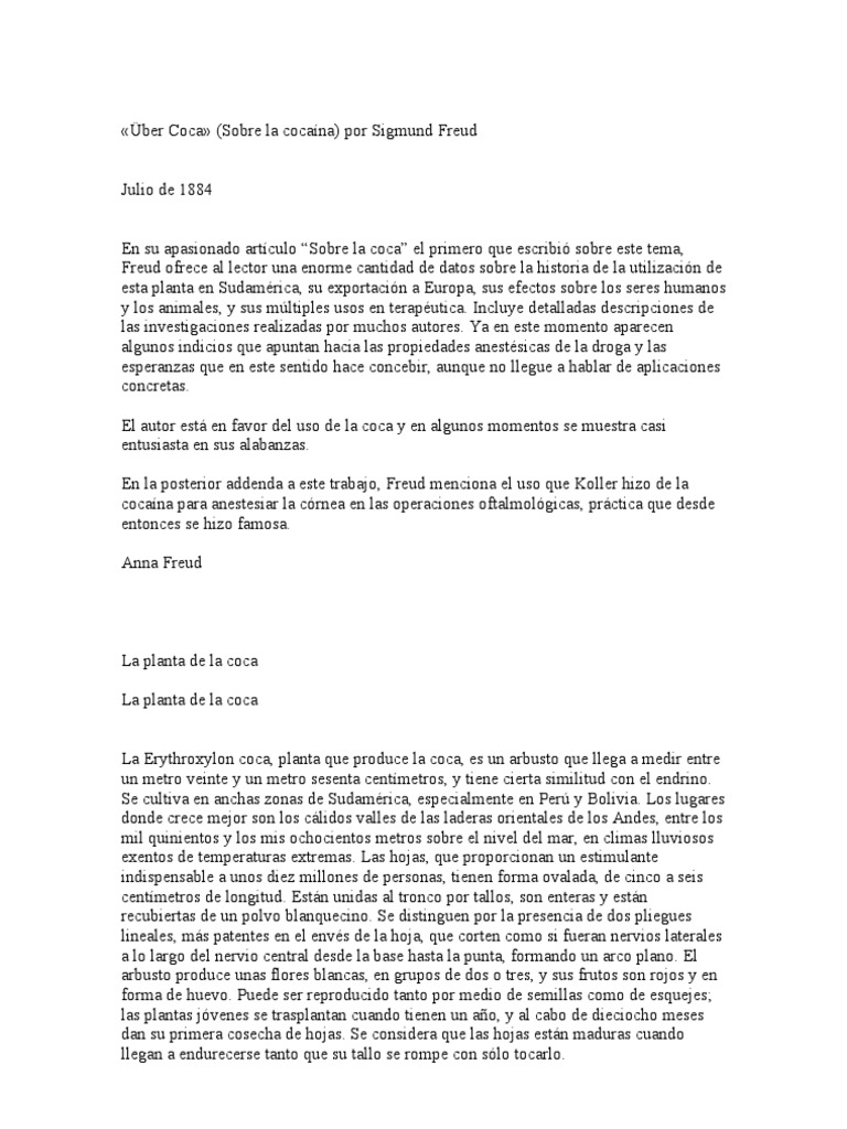 Coca, Diciembre de 1884 Coca, Diciembre de 1884 Muchas revistas mdicas norteamericanas publicaban peridicamente pginas de traducciones de textos extranjeros. El artculo que sigue fue la primera traduccin de ber Coca de Sigmund Freud al ingls, pero debe tenerse en cuenta que no es una traduccin en el sentido corriente del trmino. Es a la vez un resumen del artculo original y un compendio de varias fuentes. En especial debera notarse que la opinin sobre el uso de la cocana para el tratamiento del morfinismo no es de Freud sino de Fleischl, y probablemente fue tomada del artculo de E. Merck. La planta Erythraxylon coca es cultivada en extensas reas de Sudamrica, sobre todo en Per y Bolivia. Era una planta que conocieron y valoraron altamente los conquistadores espaoles del Per. La planta estaba estrechamente vinculada a ceremonias religiosas. Las hojas eran ofrecidas en sacrificio a los dioses, masticadas durante la adoracin, y puestas en la boca de los muertos a fin de asegurarles una favorable acogida en el otro mundo. El gobierno local de Lima prohibi su uso tachndolo de pagano y pecaminoso. Pero cuando los espaoles vieron que los indios no podan realizar las pesadas tareas que les imponan en las minas si no tomaban esas hojas, suprimieron la prohibicin. Se la daban a sus trabajadores tres o cuatro veces al da, y la costumbre ha continuado hasta nuestros das. Los indios llevan consigo, cuando van errantes de un pueblo a otro, una bolsa con hojas de coca, y tambin un frasco con cenizas de un rbol. Hacen con las hojas una bola en la boca, la perforan con un clavo empapado de cenizas, y despus mastican la bola envolvindola con saliva. Suelen tomar generalmente entre cien y ciento veinte gramos