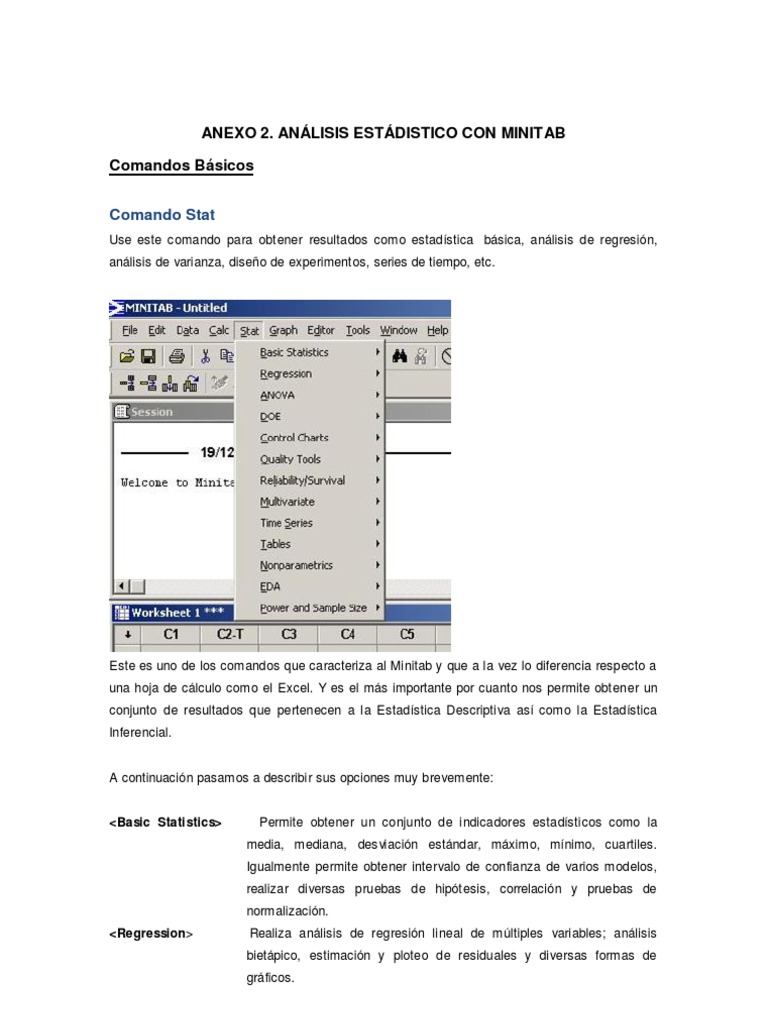 Este es uno de los comandos que caracteriza al Minitab y que a la vez lo diferencia respecto a una hoja de clculo como el Excel. Y es el ms importante por cuanto nos permite obt ener un conjunto de resultados que pertenecen a la Estadstica Descriptiva as como la Estadstica Inferencial.