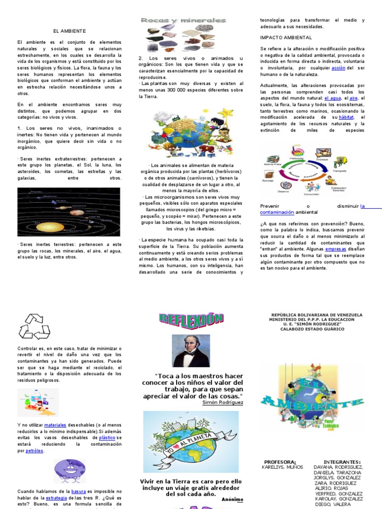 y est constituido por los seres biolgicos y fsicos. La flora, la fauna y los seres humanos representan los elementos biolgicos que conforman el ambiente y actan en estrecha relacin necesitndose unos a otros. En el ambiente encontramos seres muy distintos, que podemos agrupar en dos categoras: no vivos y vivos. 1. Los seres no vivos, inanimados o inertes: No tienen vida y pertenecen al mundo inorgnico, que quiere decir sin vida o no orgnico. Seres inertes extraterrestres: pertenecen a este grupo los planetas, el Sol, la luna, los asteroides, los cometas, las estrellas y las galaxias, entre otros.