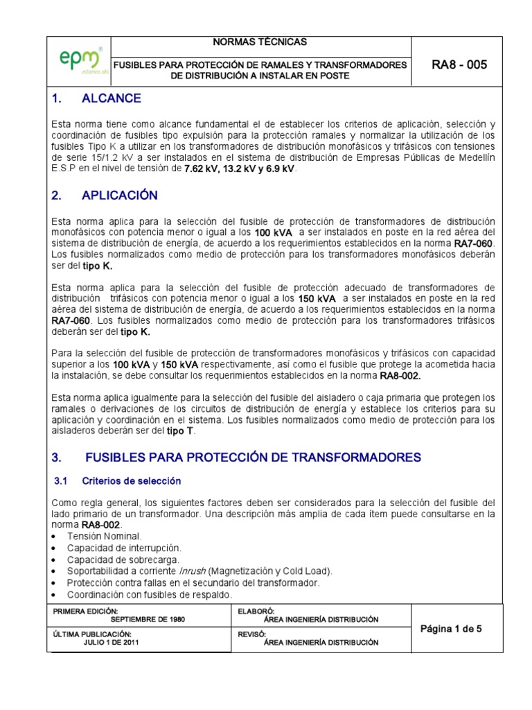 Esta norma tiene como alcance fundamental el de establecer los criterios de aplicacin, seleccin y coordinacin de fusibles tipo expulsin para la proteccin ramales y normalizar la utilizacin de los fusiblesTipoKautilizarenlostransformadoresdedistribucinmonofsicosytrifsicoscontensiones de serie 15/1.2 kV a ser instalados en el sistema de distribucin de Empresas Pblicas de Medelln E.S.Penelniveldetensinde7.62kV,13.2kVy6.9kV.