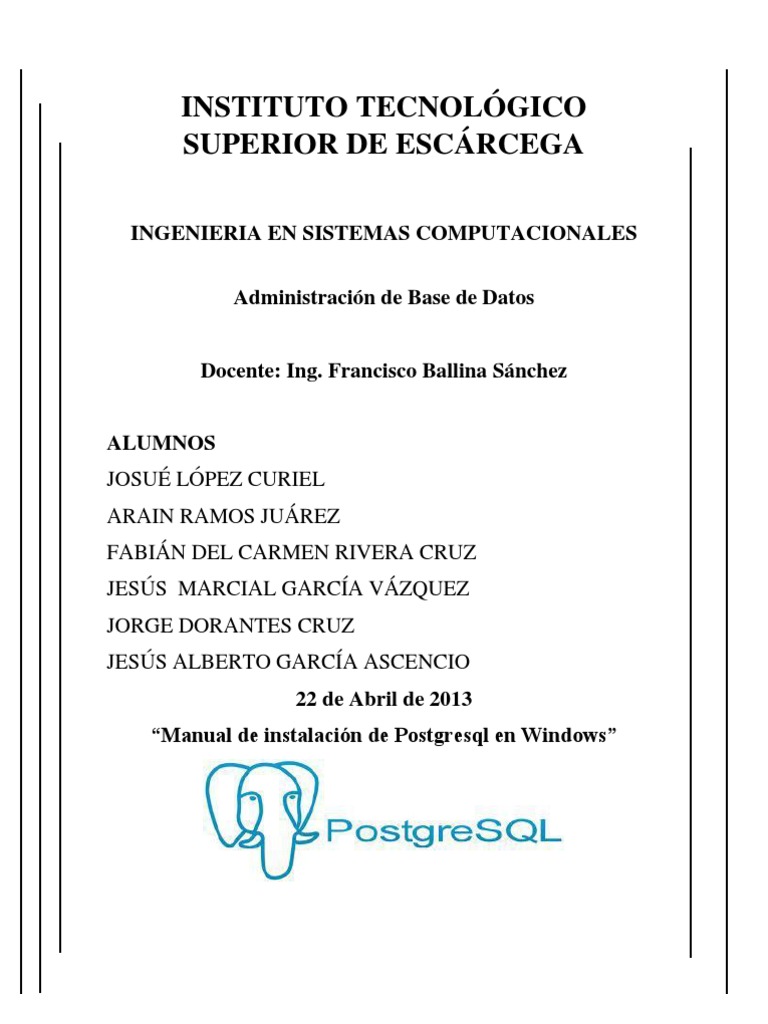 ALUMNOS JOSU LPEZ CURIEL ARAIN RAMOS JUREZ FABIN DEL CARMEN RIVERA CRUZ JESS MARCIAL GARCA VZQUEZ JORGE DORANTES CRUZ JESS ALBERTO GARCA ASCENCIO 22 de Abril de 2013 Manual de instalacin de Postgresql en Windows