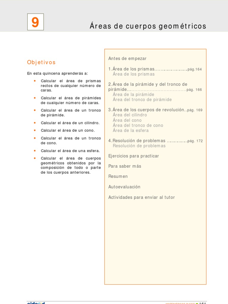 Calcular el rea de prismas rectos de cualquier nmero de caras. Calcular el rea de pirmides de cualquier nmero de caras. Calcular el rea de un tronco de pirmide. Calcular el rea de un cilindro. Calcular el rea de un cono. Calcular el rea de un tronco de cono. Calcular el rea de una esfera. Calcular el rea de cuerpos geomtricos obtenidos por la composicin de todo o parte de los cuerpos anteriores.