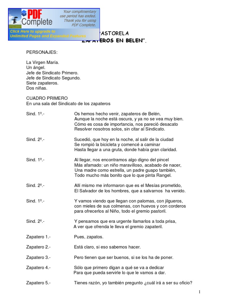 PERSONAJES: La Virgen Mara. Un ngel. Jefe de Sindicato Primero. Jefe de Sindicato Segundo. Siete zapateros. Dos nias. CUADRO PRIMERO En una sala del Sindicato de los zapateros Sind. 1.Os hemos hecho venir, zapateros de Beln, Aunque la noche est oscura, y ya no se vea muy bien. Cmo es cosa de importancia, nos pareci desacato Resolver nosotros solos, sin citar al Sindicato. Sucedi, que hoy en la noche, al salir de la ciudad Se rompi la bicicleta y comenc a caminar Hasta llegar a una gruta, donde haba gran claridad. Al llegar, nos encontramos algo digno del pincel Ms afamado: un nio maravilloso, acabado de nacer, Una madre como estrella, un padre guapo tambin, Todo mucho ms bonito que lo que pinta Rangel. All mismo me informaron que es el Mesas prometido, El Salvador de los hombres, que a salvarnos ha venido. Y vamos viendo que llegan con palomas, con jilgueros, con mieles de sus colmenas, con huevos y con corderos para ofrecerlos al Nio, todo el gremio pastoril. Y pensamos que era urgente llamarlos a toda prisa, A ver que ofrenda le lleva el gremio zapateril. Pues, zapatos. Est claro, si eso sabemos hacer. Pero tienen que ser buenos, si se los ha de poner. Slo que primero digan a qu se va a dedicar Para que pueda servirle lo que le vamos a dar. Tienes razn, yo tambin pregunto cul ir a ser su oficio? 1