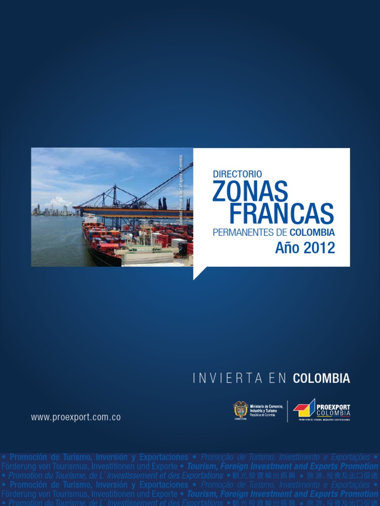 El escenario y las condiciones para invertir en Colombia han cambiado en los ltimos aos. Nuestro pas es ahora el tercer destino con el mejor ambiente para hacer negocios y con los entornos regulatorios ms favorables de Latinoamrica y el Caribe, segn el informe Doing Business del Banco Mundial. Somos quintos en el mundo y primeros en Amrica Latina en proteger a los inversionistas y contamos con una economa reconocida por su confiabilidad, seriedad, buenas prcticas empresariales, as como la responsabilidad social y ambiental. Estos son ejemplos que reconocen el trabajo hecho por Colombia para recobrar la confianza inversionista y que se reflejan en el aumento positivo de los ndices de inversin extranjera directa en los ltimos aos. Una de las herramientas clave que se proyecta como gran generadora de inversin son las zonas francas, entre otras razones por ofrecer incentivos como impuesto a la renta del 15 por ciento, la exencin del pago del IVA (Impuesto al Valor Agregado) y posibilidad de vender en el mercado domstico. Dentro de este contexto, en momentos en que Colombia se integra al mundo mediante tratados de libre comercio y con el fortalecimiento de sus relaciones comerciales con sus socios latinoamericanos, la promocin y difusin del potencial de las zonas francas colombianas se ha convertido en una actividad crucial en la estrategia de Proexport. Las perspectivas que se abrieron con la aprobacin del TLC con Estados Unidos por parte del Congreso de este pas en 2011 y los que en el mismo ao entraron en vigencia, como Canad y Suiza adems de la renovacin del tratado con Mxico-, se convierten en atractivos para los potenciales inversionistas que ven a Colombia como una plataforma para ampliar sus mercados. Este directorio ser una puerta de entrada para que los inversionistas conozcan las 33 zonas francas declaradas en nuestro pas e identifiquen cul se ajusta a sus necesidades, y para complementar esa informacin tienen a su disposicin nuestra red de oficinas de Proexport en el mundo.