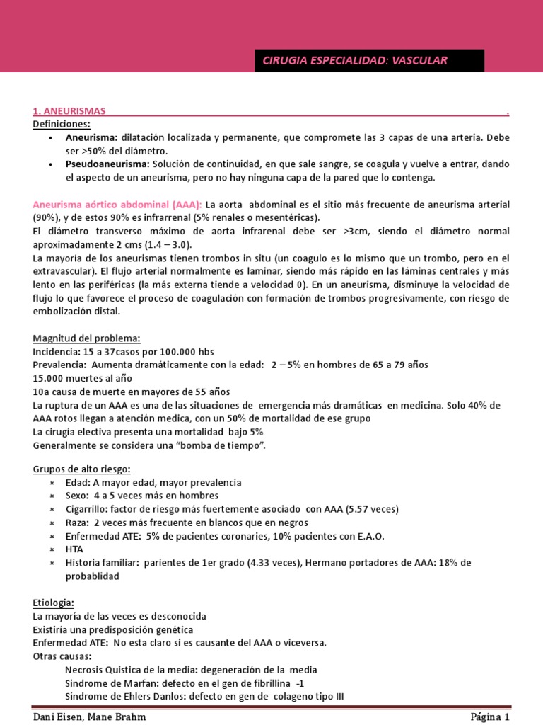 1. ANEURISMAS . Definiciones: Aneurisma: dilatacin localizada y permanente, que compromete las 3 capas de una arteria. Debe ser >50% del dimetro. Pseudoaneurisma: Solucin de continuidad, en que sale sangre, se coagula y vuelve a entrar, dando el aspecto de un aneurisma, pero no hay ninguna capa de la pared que lo contenga. Aneurisma artico abdominal (AAA): La aorta abdominal es el sitio ms frecuente de aneurisma arterial (90%), y de estos 90% es infrarrenal (5% renales o mesentricas). El dimetro transverso mximo de aorta infrarenal debe ser >3cm, siendo el dimetro normal aproximadamente 2 cms (1.4 3.0). La mayora de los aneurismas tienen trombos in situ (un coagulo es lo mismo que un trombo, pero en el extravascular). El flujo arterial normalmente es laminar, siendo ms rpido en las lminas centrales y ms lento en las perifricas (la ms externa tiende a velocidad 0). En un aneurisma, disminuye la velocidad de flujo lo que favorece el proceso de coagulacin con formacin de trombos progresivamente, con riesgo de embolizacin distal. Magnitud del problema: Incidencia: 15 a 37casos por 100.000 hbs Prevalencia: Aumenta dramticamente con la edad: 2 5% en hombres de 65 a 79 aos 15.000 muertes al ao 10a causa de muerte en mayores de 55 aos La ruptura de un AAA es una de las situaciones de emergencia ms dramticas en medicina. Solo 40% de AAA rotos llegan a atencin medica, con un 50% de mortalidad de ese grupo La ciruga electiva presenta una mortalidad bajo 5% Generalmente se considera una bomba de tiempo. Grupos de alto riesgo: Edad: A mayor edad, mayor prevalencia Sexo: 4 a 5 veces ms en hombres Cigarrillo: factor de riesgo ms fuertemente asociado con AAA (5.57 veces) Raza: 2 veces ms frecuente en blancos que en negros Enfermedad ATE: 5% de pacientes coronaries, 10% pacientes con E.A.O. HTA Historia familiar: parientes de 1er grado (4.33 veces), Hermano portadores de AAA: 18% de probablidad Etiologia: La mayora de las veces es desconocida Existira una predisposicin gentica Enfermedad ATE: No esta claro si es causante del AAA o viceversa. Otras causas: Necrosis Quistica de la media: degeneracin de la media Sindrome de Marfan: defecto en el gen de fibrillina -1 Sndrome de Ehlers Danlos: defecto en gen de colageno tipo III Dani Eisen, Mane Brahm Pgina 1