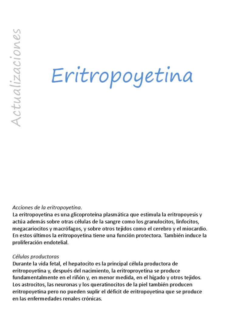 Clulas productoras Durante la vida fetal, el hepatocito es la principal clula productora de eritropoyetina y, despus del nacimiento, la eritroproyetina se produce fundamentalmente en el rin y, en menor medida, en el hgado y otros tejidos. Los astrocitos, las neuronas y los queratinocitos de la piel tambin producen eritropoyetina pero no pueden suplir el dficit de eritropoyetina que se produce en las enfermedades renales crnicas.