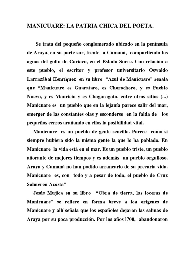 la zona. Algunos pobladores no dejaron la pennsula. Se trasladaron a un pequeo poblado indgena conocido como Manicuare, cercano a Araya y ubicado en las tranquilas aguas del golfo de Cariaco. Ms cercano a la proteccin que ofreca Cuman, ante las incursiones de los holandeses que buscaban la sal. Sus habitantes se dedicaron a las labores del mar, cra de cabras y a la elaboracin de cermica. Ante el cambio poltico-territorial ocurrido en Venezuela en la dcada de los aos 80,los pueblos de la pennsula de Araya se movilizan para crear el Municipio Cruz Salmern Acosta para no seguir dependiendo de la metrpoli cumanesa. El Comit Pro-Municipalidad, aparte del nombre recibi las propuestas de capital a las localidades de Araya y Manicuare. La decisin en torno a esta aspiracin de los nativos peninsulares fue tomada por la Asamblea Legislativa sucrense. Seala el profesor Carlos Reinales Mago, de origen peninsular, en su libro Araya contada por arayeros que el municipio con el epnimo del poeta aparece en la Gaceta Oficial del Estado Sucre N 31 del 5 de Diciembre de l986 sealando como capital a Araya.