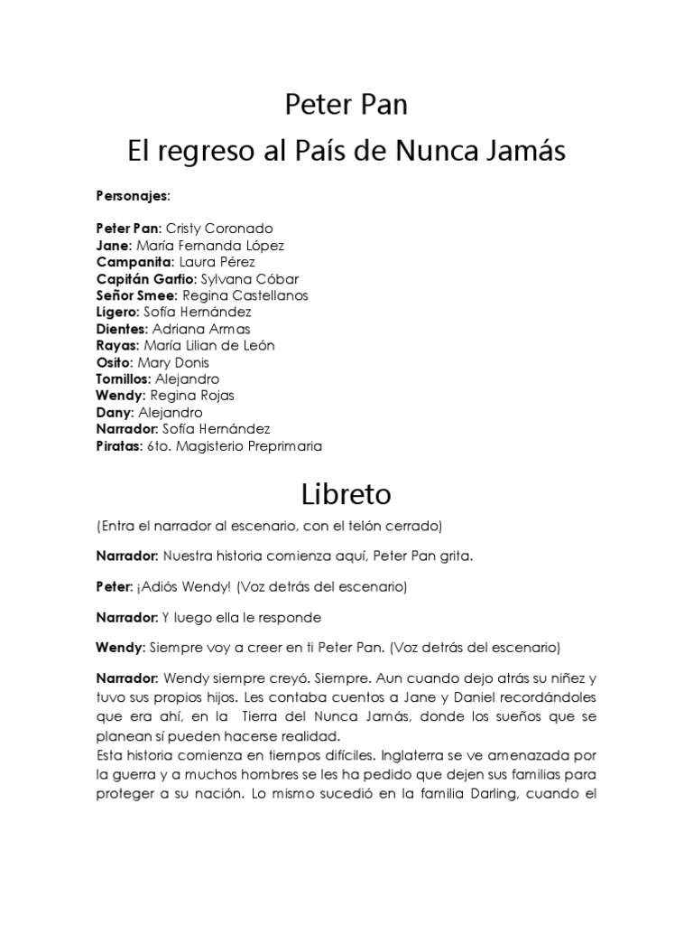 padre de Jane le pidi que cuidara a su mam y a su hermano Daniel antes de partir a la guerra, la cual dur ms de lo que se haba esperado hasta destrozar el corazn mismo de Londres. Para proteger a los nios, el gobierno decret que deban irse al campo para mantenerlos a salvo. En momentos como este es normal que se olviden algunas cosas de nios como Peter Pan y el Pas del Nunca Jams. (Se escuchan algunas sirenas y bombas) Wendy: Corre Daniel! (Lo carga) Dany: Dnde est Jane? Wendy: Tranquilo, ya vendr. (Entran al escenario). Dany: Tengo miedo no me gustan las bombas ni los aviones. Wendy: Aviones? Por un momento cre que eran caones de un barco pirata. Dany: El capitn Garfio! Lo escuch ya viene. (Entra Jane al escenario) Wendy y Dany: Jane! (Wendy abraza a Jane) Wendy: Dnde estabas? Jane: Le traje un regalo a Daniel. Dany: (Emocionado) Qu es, qu es? Ah, son calcetines, y son dos. Jane: Los compr talla grande para que le duren. Wendy: (Toma los calcetines) Mira Daniel es Peter Pan y Capitn Garfio. (Juega como si fueran tteres y le cuenta un cuento) Jane: Hay madre! (Escucha radio con audfonos) (Daniel se queda dormido mientras regresan a casa) Jane: Por qu le llenas la cabeza con esos cuentos? Wendy: (Preocupada) Jane, promteme algo.