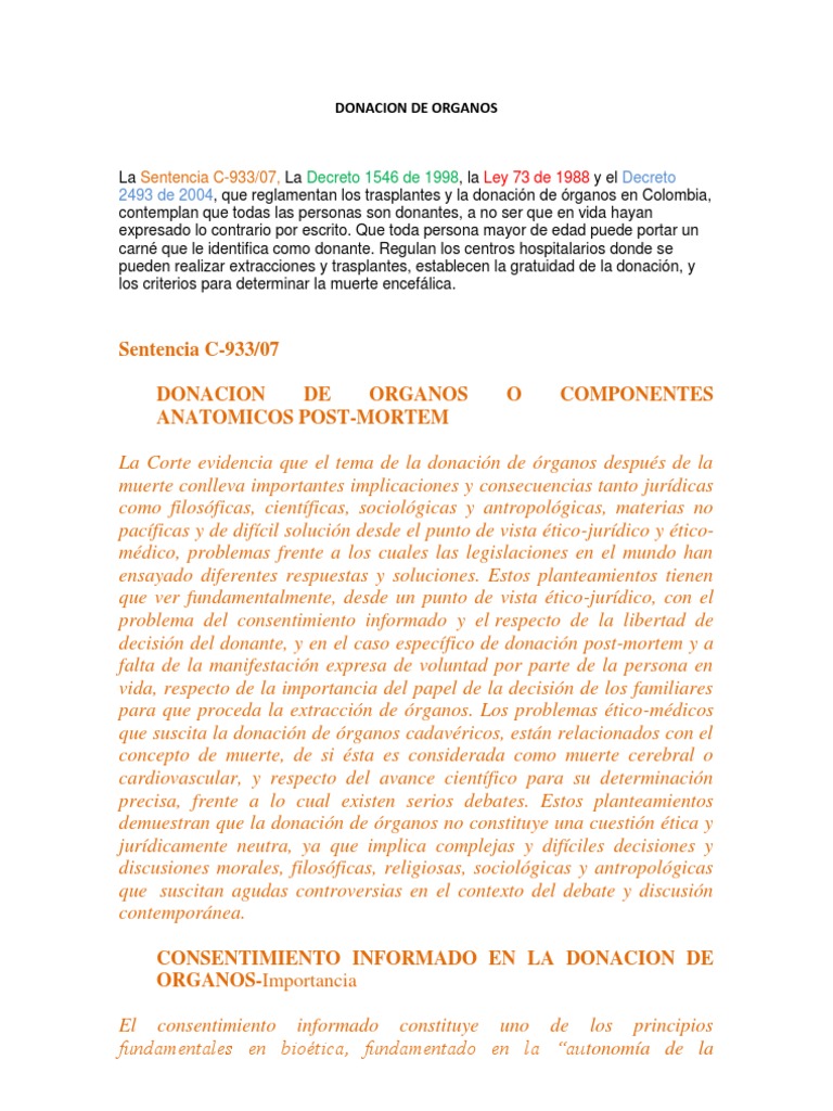 La Sentencia C-933/07, La Decreto 1546 de 1998, la Ley 73 de 1988 y el Decreto 2493 de 2004, que reglamentan los trasplantes y la donacin de rganos en Colombia, contemplan que todas las personas son donantes, a no ser que en vida hayan expresado lo contrario por escrito. Que toda persona mayor de edad puede portar un carn que le identifica como donante. Regulan los centros hospitalarios donde se pueden realizar extracciones y trasplantes, establecen la gratuidad de la donacin, y los criterios para determinar la muerte enceflica.