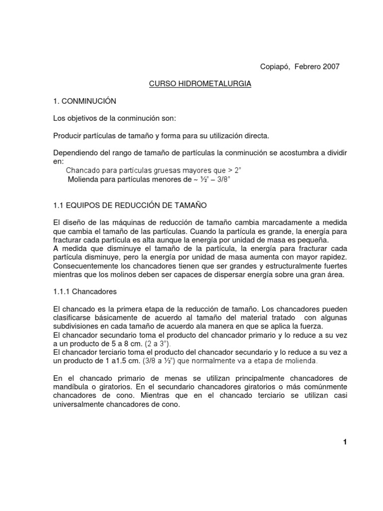 1.1 EQUIPOS DE REDUCCIN DE TAMAO El diseo de las mquinas de reduccin de tamao cambia marcadamente a medida que cambia el tamao de las partculas. Cuando la partcula es grande, la energa para fracturar cada partcula es alta aunque la energa por unidad de masa es pequea. A medida que disminuye el tamao de la partcula, la energa para fracturar cada partcula disminuye, pero la energa por unidad de masa aumenta con mayor rapidez. Consecuentemente los chancadores tienen que ser grandes y estructuralmente fuertes mientras que los molinos deben ser capaces de dispersar energa sobre una gran rea. 1.1.1 Chancadores El chancado es la primera etapa de la reduccin de tamao. Los chancadores pueden clasificarse bsicamente de acuerdo al tamao del material tratado con algunas subdivisiones en cada tamao de acuerdo ala manera en que se aplica la fuerza. El chancador secundario toma el producto del chancador primario y lo reduce a su vez a un producto de 5 a 8 cm. (2 a 3). El chancador terciario toma el producto del chancador secundario y lo reduce a su vez a un producto de 1 a1.5 cm. (3/8 a ) que normalmente va a etapa de molienda. En el chancado primario de menas se utilizan principalmente chancadores de mandbula o giratorios. En el secundario chancadores giratorios o ms comnmente chancadores de cono. Mientras que en el chancado terciario se utilizan casi universalmente chancadores de cono.