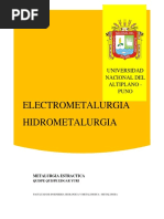 2. HIDROMETALURGIA CONCEPTO La hidrometalurgia estudia el conjunto de procesos que emplean reacciones qumicas en soluciones acuosas para la extraccin de metales a partir de sus minerales y concentrados. Estas reacciones qumicas pueden ser efectuadas mediante agentes qumicos cidos o bsicos, y agentes bacteriales, con los nombres de lixiviacin cida, lixiviacin alcalina, lixiviacin neutra y lixiviacin bacteriana. La hidrometalurgia tambin emplea mtodos electroqumicos, como la electro-oxidacin, electro-deposicin y electrorrefinacin. La extraccin por solventes, el intercambio inico y la adsorcin con carbn activado son procesos que pertenecen a la hidrometalurgia. La hidrometalurgia utiliza las siguientes tcnicas: Lixiviacin. Clarificacin, purificacin y concentracin de la solucin obtenida. Recuperacin del metal como producto final, generalmente en forma elemental.
