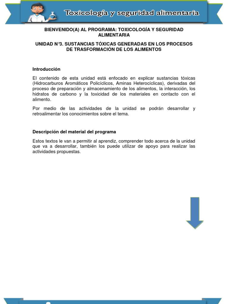 Introduccin El contenido de esta unidad est enfocado en explicar sustancias txicas (Hidrocarburos Aromticos Policclicos, Aminas Heterocclicas), derivadas del proceso de preparacin y almacenamiento de los alimentos, la interaccin, los hidratos de carbono y la toxicidad de los materiales en contacto con el alimento. Por medio de las actividades de la unidad se podrn desarrollar y retroalimentar los conocimientos sobre el tema.