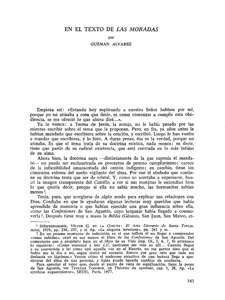 Empieza asi: Estandohoy suplicando a nuestro Senor hablase por mi, porque yo no atinaba a cosa que decir, ni como comenzar a cumplir esta obediencia, se me ofrecio lo que ahora dire...^. Ya lo vemos: a Teresa de Jesus, la monja, no le habia pasado por las mientes escribir sobre el tema que le proponen. Pero, en fin, ya anos antes le habian mandado que escribiera sobre la oracion, y escribio. Luego le han vuelto a mandar que escribiera, y lo hizo. A duras penas, esa es la verdad, porque no atinaba. Es que el tema trata de su doctrina mistica, nada menos; es decir, tiene que partir de su radical existencia, que esta centrada en lo mas intimo de su alma. Ahora bien, la doctrina suya -distintamente de la que suponia el mandato- no puede ser enclaustrada en preceptos de penoso cumplimiento; carece de la inflexibilidad amazacotada del centon indigesto; en cambio, tiene los cimientos etereos del sueno vigilante del alma. Por eso el simbolo que contiene su doctrina tenia que ser de cristal. Y, como no acertaba a expresarse, busco la imagen transparente del Cmtillo, a ver si sus monjitas le entendian bien lo que queria decir, porque si ella no sabia mucho, las hermanitas sabian menos l. Tenia, pues, que arreglarse de algun modo para explicar sus relaciones con Dios. Confiaba en que le ayudaran algunas lecturas muy queridas que habia aprendido de memoria o que habian ejercido una gran influencia sobre ella, como las Confesiones de San Agustin, cuyo lenguaje habia llegado a conmoverla2. Despues tiene muy a mano la Biblia (Genesis, San Juan, San Mateo, et1 Diferentemente, V~CTOR G. DE LA CONCHA: El Arte Literario d e Santa Teresa, Ariel, 1978, pp. 236, 237, y el Ap. aLa alegoria teresiana)), pp. 263 y SS. 2 En un penoso momento de indecision en el que influia el no llegar a comprender acosas subidas)), cayo en sus manos el libro de las Confesiones de San Agustin. Del comentario que a proposito hace en el libro de su Vida (cap. IX, 5 , 6, 7, 8) entresaco lo siguiente: ((Como comence a leer L.C. pareceme me veia yo alli ... Cuando llegue a su conversion y lei como oyo aquella voz en el Huerto, no me parece sino que el Senor me la dio a mi, segun sintio mi corazan. Estuve por gran rato que toda me deshacia en lagrimas.)) Vemos c6mo el poderoso atractivo de una lectura llega a apoderarse del alma de una persona, y hasta puede hacerle cambiar de conducta. Para apreciar el valor que, desde el punto de vista de significacion, tiene la prosa de San Agustin, ver TZVETAN TODOROF, en Theories du symbole, cap. 1, 28, Ap. La synthkse augustiniennen, SEUIL, Paris, 1977.