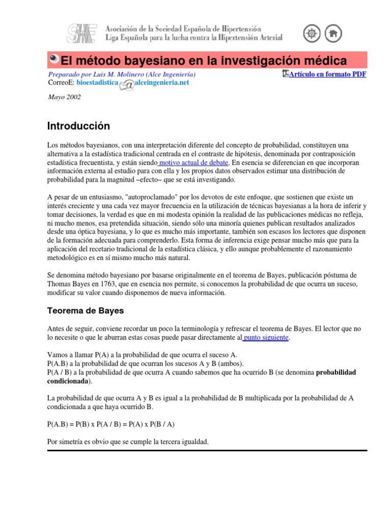 Los mtodos bayesianos, con una interpretacin diferente del concepto de probabilidad, constituyen una alternativa a la estadstica tradicional centrada en el contraste de hiptesis, denominada por contraposicin estadstica frecuentista, y estn siendo motivo actual de debate. En esencia se diferencian en que incorporan informacin externa al estudio para con ella y los propios datos observados estimar una distribucin de probabilidad para la magnitud efecto que se est investigando. A pesar de un entusiasmo, "autoproclamado" por los devotos de este enfoque, que sostienen que existe un inters creciente y una cada vez mayor frecuencia en la utilizacin de tcnicas bayesianas a la hora de inferir y tomar decisiones, la verdad es que en mi modesta opinin la realidad de las publicaciones mdicas no refleja, ni mucho menos, esa pretendida situacin, siendo slo una minora quienes publican resultados analizados desde una ptica bayesiana, y lo que es mucho ms importante, tambin son escasos los lectores que disponen de la formacin adecuada para comprenderlo. Esta forma de inferencia exige pensar mucho ms que para la aplicacin del recetario tradicional de la estadstica clsica, y ello aunque probablemente el razonamiento metodolgico es en s mismo mucho ms natural. Se denomina mtodo bayesiano por basarse originalmente en el teorema de Bayes, publicacin pstuma de Thomas Bayes en 1763, que en esencia nos permite, si conocemos la probabilidad de que ocurra un suceso, modificar su valor cuando disponemos de nueva informacin.