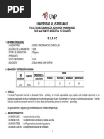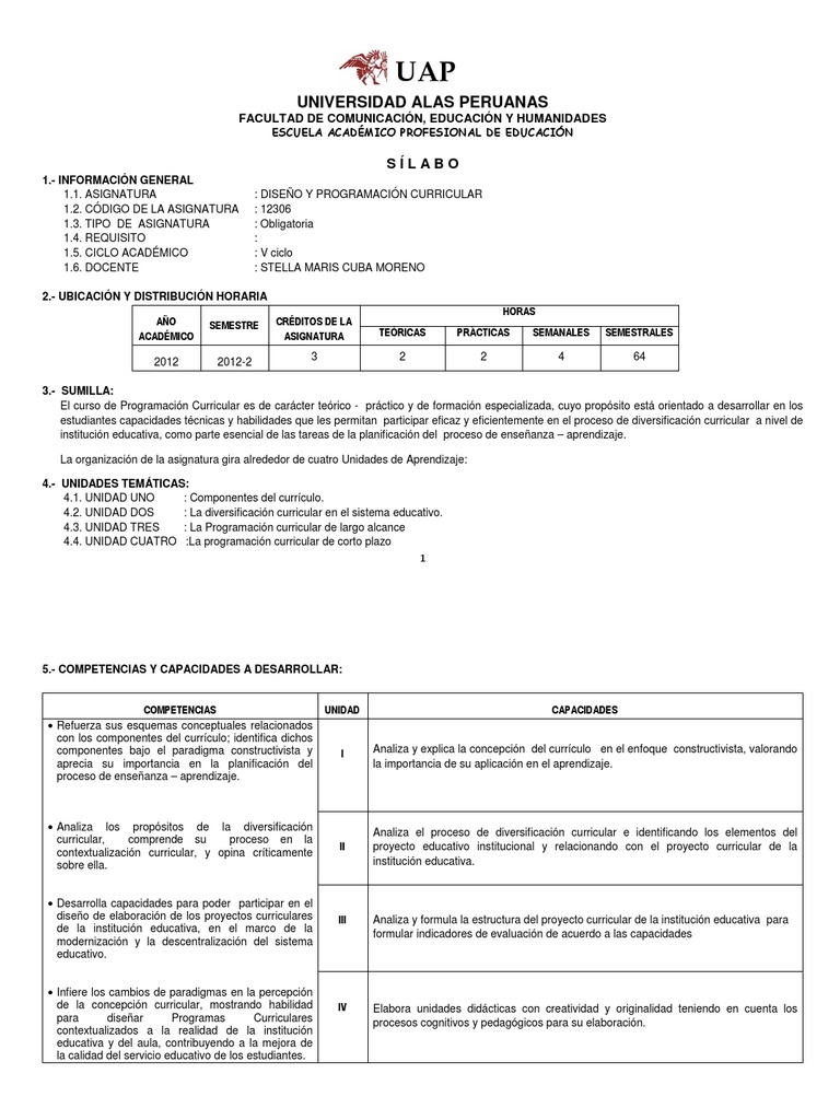 3.- SUMILLA: El curso de Programacin Curricular es de carcter terico - prctico y de formacin especializada, cuyo propsito est orientado a desarrollar en los estudiantes capacidades tcnicas y habilidades que les permitan participar eficaz y eficientemente en el proceso de diversificacin curricular a nivel de institucin educativa, como parte esencial de las tareas de la planificacin del proceso de enseanza aprendizaje. La organizacin de la asignatura gira alrededor de cuatro Unidades de Aprendizaje: 4.- UNIDADES TEMTICAS: 4.1. UNIDAD UNO : Componentes del currculo. 4.2. UNIDAD DOS : La diversificacin curricular en el sistema educativo. 4.3. UNIDAD TRES : La Programacin curricular de largo alcance 4.4. UNIDAD CUATRO :La programacin curricular de corto plazo 1