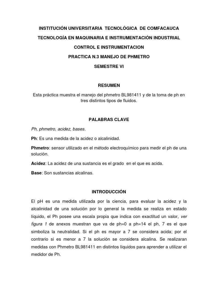 INTRODUCCIN El pH es una medida utilizada por la ciencia, para evaluar la acidez y la alcalinidad de una solucin por lo general la medida se realiza en estado lquido, el Ph posee una escala propia que indica con exactitud un valor, ver figura 1 de anexos muestran que va de ph=0 a ph=14 el ph, 7 es el que simboliza la neutralidad. Si el ph es mayor a 7 se considera acida; por el contrario si es menor a 7 la solucin se considera alcalina. Se realizaran medidas con Phmetro BL981411 en distintos lquidos para aprender a utilizar el medidor de Ph.