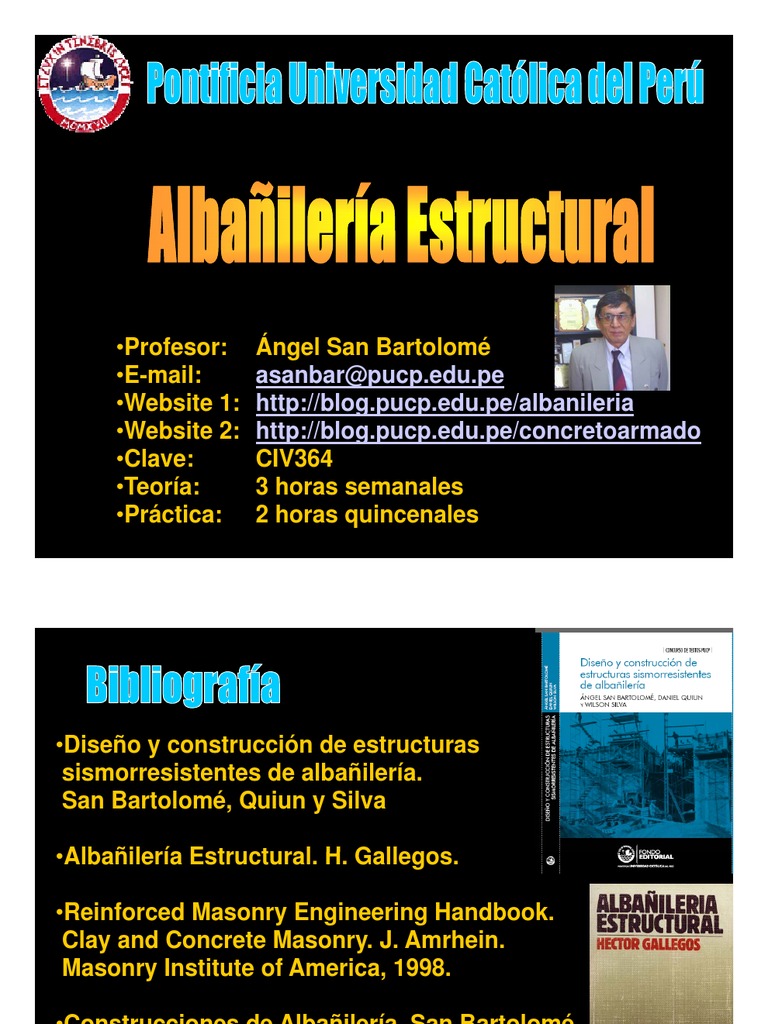 ngel San Bartolom asanbar@pucp.edu.pe http://blog.pucp.edu.pe/albanileria http://blog.pucp.edu.pe/concretoarmado CIV364 3 horas semanales 2 horas quincenales