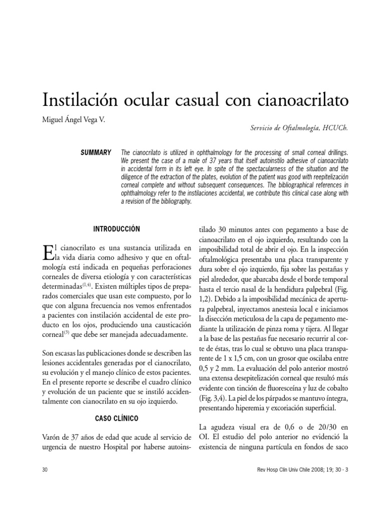 l cianocrilato es una sustancia utilizada en la vida diaria como adhesivo y que en oftalmologa est indicada en pequeas perforaciones corneales de diversa etiologa y con caractersticas determinadas (1,4). Existen mltiples tipos de preparados comerciales que usan este compuesto, por lo que con alguna frecuencia nos vemos enfrentados a pacientes con instilacin accidental de este producto en los ojos, produciendo una causticacin corneal(3) que debe ser manejada adecuadamente. Son escasas las publicaciones donde se describen las lesiones accidentales generadas por el cianocrilato, su evolucin y el manejo clnico de estos pacientes. En el presente reporte se describe el cuadro clnico y evolucin de un paciente que se instil accidentalmente con cianocrilato en su ojo izquierdo.
