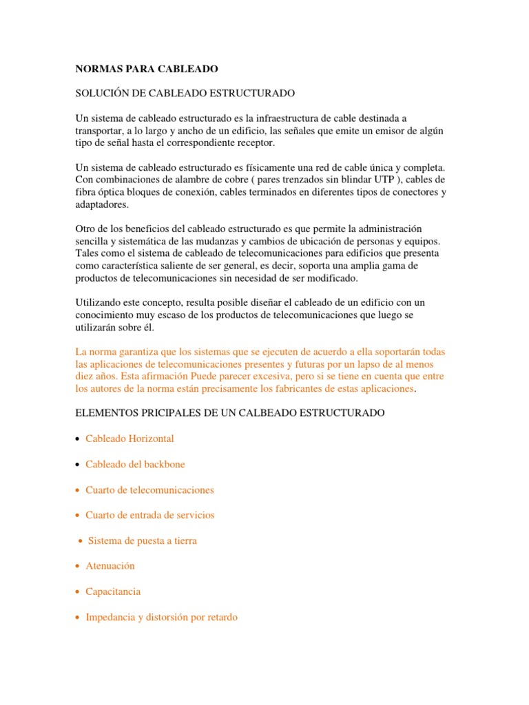 de un edificio, las seales que emite un emisor de algn tipo de seal hasta el correspondiente receptor. Un sistema de cableado estructurado es fsicamente una red de cable nica y completa. Con combinaciones de alambre de cobre ( pares trenzados sin blindar UTP ), cables de fibra ptica bloques de conexin, cables terminados en diferentes tipos de conectores y adaptadores. Otro de los beneficios del cableado estructurado es que permite la administracin sencilla y sistemtica de las mudanzas y cambios de ubicacin de personas y equipos. Tales como el sistema de cableado de telecomunicaciones para edificios que presenta como caracterstica saliente de ser general, es decir, soporta una amplia gama de productos de telecomunicaciones sin necesidad de ser modificado. Utilizando este concepto, resulta posible disear el cableado de un edificio con un conocimiento muy escaso de los productos de telecomunicaciones que luego se utilizarn sobre l. La norma garantiza que los sistemas que se ejecuten de acuerdo a ella soportarn todas las aplicaciones de telecomunicaciones presentes y futuras por un lapso de al menos diez aos. Esta afirmacin Puede parecer excesiva, pero si se tiene en cuenta que entre los autores de la norma estn precisamente los fabricantes de estas aplicaciones. ELEMENTOS PRICIPALES DE UN CALBEADO ESTRUCTURADO Cableado Horizontal Cableado del backbone Cuarto de telecomunicaciones Cuarto de entrada de servicios Sistema de puesta a tierra Atenuacin Capacitancia Impedancia y distorsin por retardo