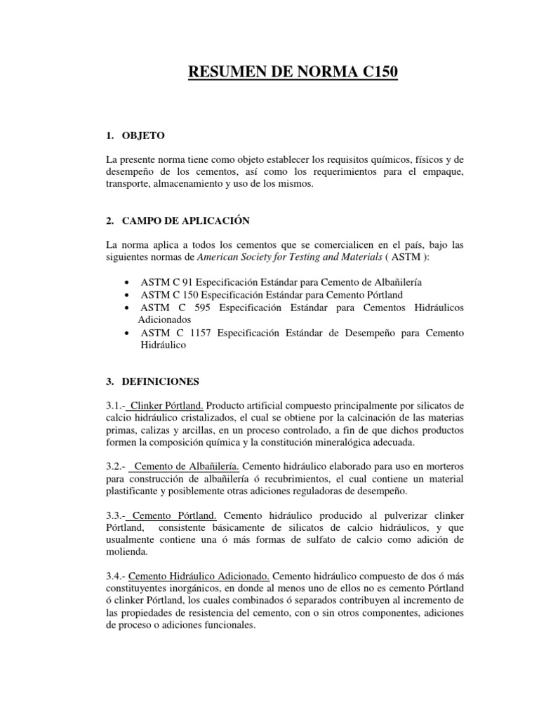 2. CAMPO DE APLICACIN La norma aplica a todos los cementos que se comercialicen en el pas, bajo las siguientes normas de American Society for Testing and Materials ( ASTM ): ASTM C 91 Especificacin Estndar para Cemento de Albailera ASTM C 150 Especificacin Estndar para Cemento Prtland ASTM C 595 Especificacin Estndar para Cementos Hidrulicos Adicionados ASTM C 1157 Especificacin Estndar de Desempeo para Cemento Hidrulico