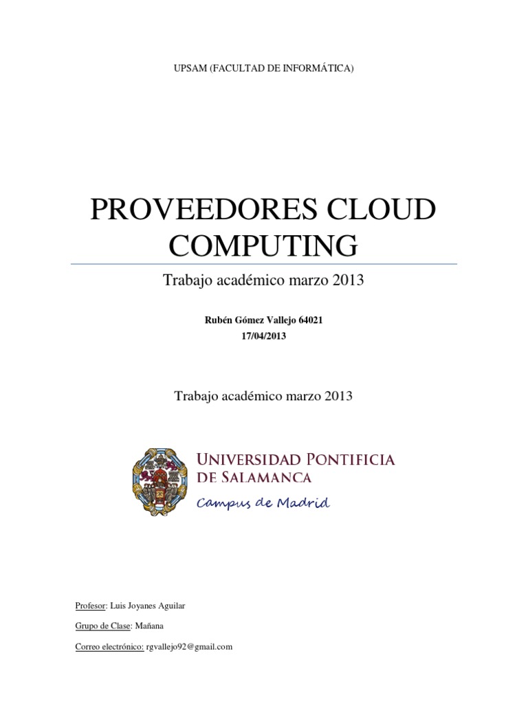 El siguiente trabajo es un estudio de los distintos proveedores de cloud computing que existen actualmente. Primero analizaremos por encima el concepto de cloud computing y que ofrece. A continuacin, analizaremos distintos proveedores de cloud computing, sus ventajas, sus inconvenientes que caractersticas ofrecen, etc. Finalmente, obtendremos una conclusin, eligiendo uno de los tres como posible solucin a nuestra empresa