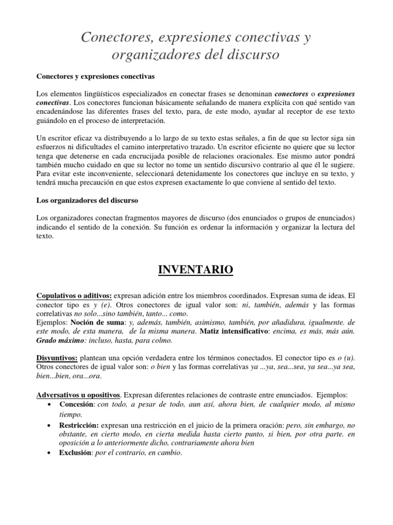 Conectores y expresiones conectivas Los elementos lingsticos especializados en conectar frases se denominan conectores o expresiones conectivas. Los conectores funcionan bsicamente sealando de manera explcita con qu sentido van encadenndose las diferentes frases del texto, para, de este modo, ayudar al receptor de ese texto guindolo en el proceso de interpretacin. Un escritor eficaz va distribuyendo a lo largo de su texto estas seales, a fin de que su lector siga sin esfuerzos ni dificultades el camino interpretativo trazado. Un escritor eficiente no quiere que su lector tenga que detenerse en cada encrucijada posible de relaciones oracionales. Ese mismo autor pondr tambin mucho cuidado en que su lector no tome un sentido discursivo contrario al que l le sugiere. Para evitar este inconveniente, seleccionar detenidamente los conectores que incluye en su texto, y tendr mucha precaucin en que estos expresen exactamente lo que conviene al sentido del texto. Los organizadores del discurso Los organizadores conectan fragmentos mayores de discurso (dos enunciados o grupos de enunciados) indicando el sentido de la conexin. Su funcin es ordenar la informacin y organizar la lectura del texto.