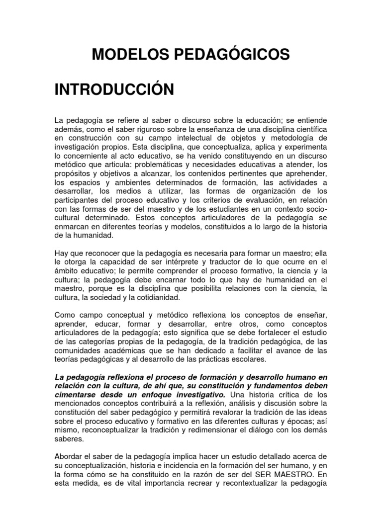 La pedagoga se refiere al saber o discurso sobre la educacin; se entiende adems, como el saber riguroso sobre la enseanza de una disciplina cientfica en construccin con su campo intelectual de objetos y metodologa de investigacin propios. Esta disciplina, que conceptualiza, aplica y experimenta lo concerniente al acto educativo, se ha venido constituyendo en un discurso metdico que articula: problemticas y necesidades educativas a atender, los propsitos y objetivos a alcanzar, los contenidos pertinentes que aprehender, los espacios y ambientes determinados de formacin, las actividades a desarrollar, los medios a utilizar, las formas de organizacin de los participantes del proceso educativo y los criterios de evaluacin, en relacin con las formas de ser del maestro y de los estudiantes en un contexto sociocultural determinado. Estos conceptos articuladores de la pedagoga se enmarcan en diferentes teoras y modelos, constituidos a lo largo de la historia de la humanidad. Hay que reconocer que la pedagoga es necesaria para formar un maestro; ella le otorga la capacidad de ser intrprete y traductor de lo que ocurre en el mbito educativo; le permite comprender el proceso formativo, la ciencia y la cultura; la pedagoga debe encarnar todo lo que hay de humanidad en el maestro, porque es la disciplina que posibilita relaciones con la ciencia, la cultura, la sociedad y la cotidianidad. Como campo conceptual y metdico reflexiona los conceptos de ensear, aprender, educar, formar y desarrollar, entre otros, como conceptos articuladores de la pedagoga; esto significa que se debe fortalecer el estudio de las categoras propias de la pedagoga, de la tradicin pedaggica, de las comunidades acadmicas que se han dedicado a facilitar el avance de las teoras pedaggicas y al desarrollo de las prcticas escolares. La pedagoga reflexiona el proceso de formacin y desarrollo humano en relacin con la cultura, de ah que, su constitucin y fundamentos deben cimentarse desde un enfoque investigativo. Una historia crtica de los mencionados conceptos contribuir a la reflexin, anlisis y discusin sobre la constitucin del saber pedaggico y permitir revalorar la tradicin de las ideas sobre el proceso educativo y formativo en las diferentes culturas y pocas; as mismo, reconceptualizar la tradicin y redimensionar el dilogo con los dems saberes. Abordar el saber de la pedagoga implica hacer un estudio detallado acerca de su conceptualizacin, historia e incidencia en la formacin del ser humano, y en la forma cmo se ha constituido en la razn de ser del SER MAESTRO. En esta medida, es de vital importancia recrear y recontextualizar la pedagoga
