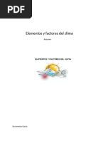 Cuando hablamos del tiempo que hace o el clima de un pas, nos estamos refiriendo a conceptos diferentes, aunque muy relacionados entre s. Se define el clima como un conjunto de fenmenos meteorolgicos que caracterizan el estados medio de la atmsfera en un rea de la superficie terrestre. Sin embargo el tiempo es el estado atmosfrico da a da y en determinada localidad. La climatologa valora las temperaturas y las precipitaciones sirvindose de medias o promedios. Para conocer la temperatura promedio de un da se realiza la media atmosfrica en veinticuatro observaciones horarias; de esta manera podemos saber la mxima y mnima temperatura. Las precipitaciones por el contrario se toman en su totalidad de modo que el totalidad, de modo que el total de lluvia cada en un mes se une al siguiente formando as el anual. Los elementos que conforman el clima son un conjunto de fenmenos relacionados entre s.