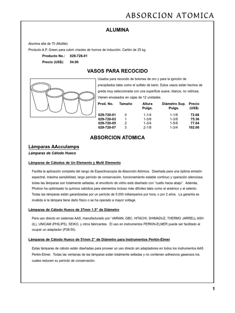 Elemento Longitud de Onda a usarse 217.6 193.7 248.3 217.0 279.5 232.0 213.7 196.0 214.3 276.8 HCl Table Ganancia de Intensidad X 12 8 12 10 6 6 6 12 8 15 5 Dimetro: 37mm Producto No. Precio (US$) 020-295-01 020-295-02 020-295-03 020-295-04 020-295-05 020-295-06 020-295-10 020-295-07 020-295-08 020-295-09 020-295-11 419.00 419.00 419.00 419.00 419.00 419.00 419.00 419.00 419.00 419.00 523.60 Dimetro: 51mm Producto No. Precio (US$) 020-296-01 020-296-02 020-296-03 020-296-04 020-296-05 020-296-06 020-296-10 020-296-07 020-296-08 020-296-09 020-296-11 550.00 550.00 550.00 550.00 550.00 550.00 550.00 550.00 550.00 550.00 628.15