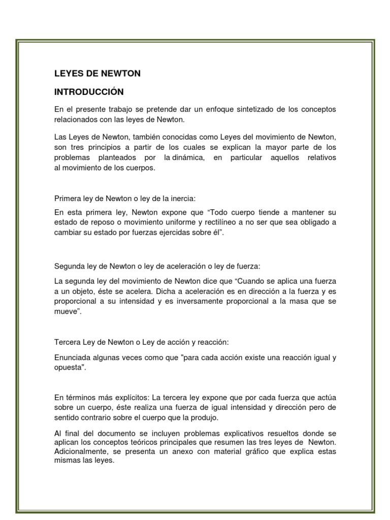 En el presente trabajo se pretende dar un enfoque sintetizado de los conceptos relacionados con las leyes de Newton. Las Leyes de Newton, tambin conocidas como Leyes del movimiento de Newton, son tres principios a partir de los cuales se explican la mayor parte de los problemas planteados por la dinmica, en particular aquellos relativos al movimiento de los cuerpos.