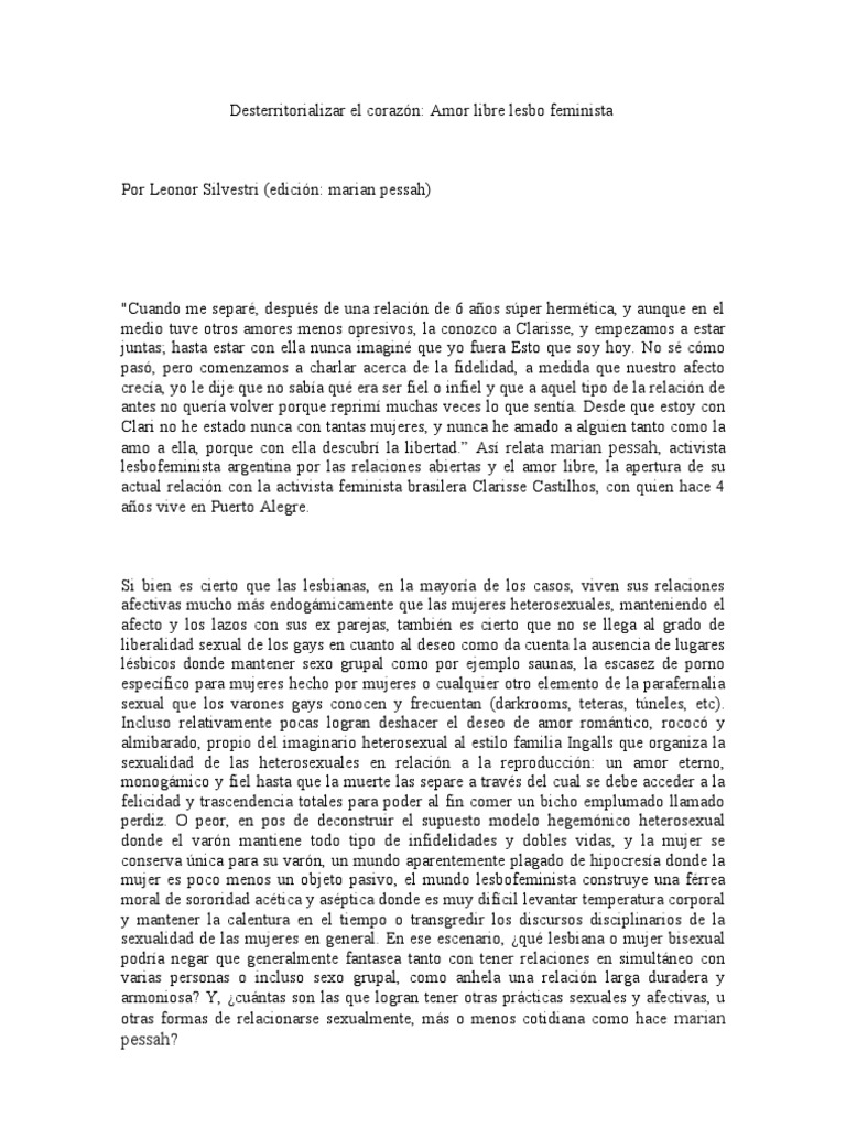 "Cuando me separ, despus de una relacin de 6 aos sper hermtica, y aunque en el medio tuve otros amores menos opresivos, la conozco a Clarisse, y empezamos a estar juntas; hasta estar con ella nunca imagin que yo fuera Esto que soy hoy. No s cmo pas, pero comenzamos a charlar acerca de la fidelidad, a medida que nuestro afecto creca, yo le dije que no saba qu era ser fiel o infiel y que a aquel tipo de la relacin de antes no quera volver porque reprim muchas veces lo que senta. Desde que estoy con Clari no he estado nunca con tantas mujeres, y nunca he amado a alguien tanto como la amo a ella, porque con ella descubr la libertad. As relata marian pessah, activista lesbofeminista argentina por las relaciones abiertas y el amor libre, la apertura de su actual relacin con la activista feminista brasilera Clarisse Castilhos, con quien hace 4 aos vive en Puerto Alegre.