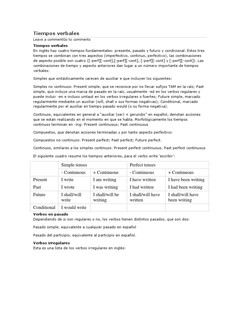 Tiempos verbales En ingls hay cuatro tiempos fundamentales: presente, pasado y futuro y condicional. Estos tres tiempos se combinan con tres aspectos (imperfectivo, continuo, perfectivo), las combinaciones de aspecto posible son cuatro ([-perf][-cont],[-perf][-cont], [-perf][-cont] y [-perf][-cont]). Las combinaciones de tiempo y aspecto anteriores dan lugar a un nmero importante de tiempos verbales: Simples que sintcticamente carecen de auxiliar e que incluyen los siguientes: Simples no continuos: Present simple, que se reconoce por no llevar sufijos TAM en la raz; Past simple, que incluye una marca de pasado en la raz, usualmente -ed en los verbos regulares y puede incluir -en e incluso umlaut en los verbos irregulares o fuertes; Future simple, marcado regularmente mediante un auxiliar (will, shall o sus formas negativas); Conditional, marcado regularmente por el auxiliar en tiempo pasado would (o su forma negativa). Continuos, equivalentes en general a auxiliar (ser) + gerundio en espaol, denotan a cciones que se estn realizando en el momento en que se habla. Morfolgicamente los tiempos continuos terminan en -ing: Present continuous; Past continuous Compuestos, que denotan acciones terminadas y por tanto aspecto perfectivo: Compuestos no-continuos: Present perfect; Past perfect; Future perfect. Continuos, similares a los simples continuos: Present perfect continuous; Past perfect continuous El siguiente cuadro resume los tiempos anteriores, para el verbo write escribir: