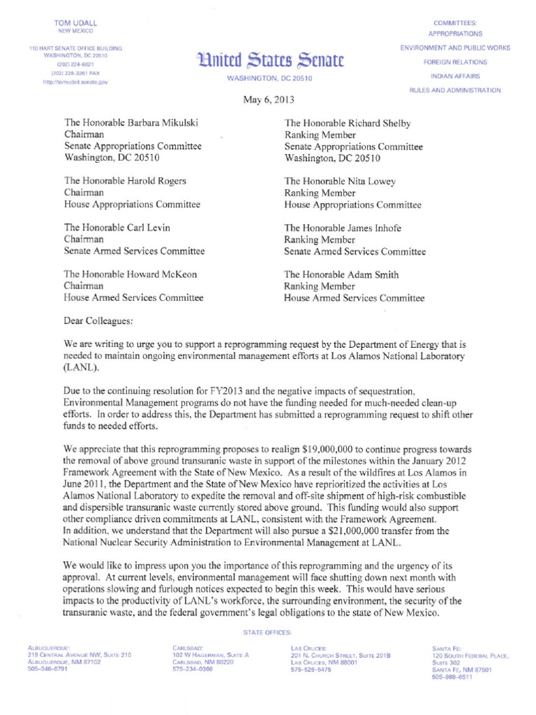 Senators Tom Udall, Martin Heinrich and Representative Ben Ray Lujan sent a letter to the House and Senate Committees on Appropriations and Armed Services in support of a reprogramming reque…Descripción completa