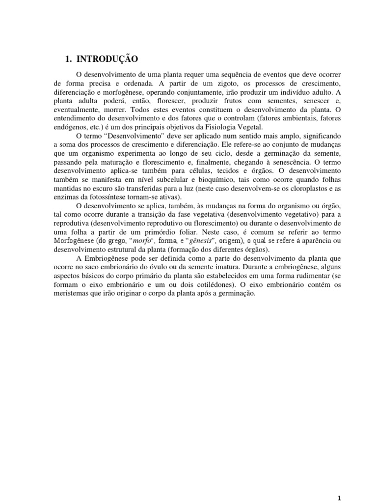 O desenvolvimento de uma planta requer uma sequência de eventos que deve ocorrer de forma precisa e ordenada. A partir de um zigoto, os processos de crescimento, diferenciação e morfogênese, operando conjuntamente, irão produzir um indivíduo adulto. A planta adulta poderá, então, florescer, produzir frutos com sementes, senescer e, eventualmente, morrer. Todos estes eventos constituem o desenvolvimento da planta. O entendimento do desenvolvimento e dos fatores que o controlam (fatores ambientais, fatores endógenos, etc.) é um dos principais objetivos da Fisiologia Vegetal. O termo “Desenvolvimento” deve ser aplicado num sentido mais amplo, significando a soma dos processos de crescimento e diferenciação. Ele refere-se ao conjunto de mudanças que um organismo experimenta ao longo de seu ciclo, desde a germinação da semente, passando pela maturação e florescimento e, finalmente, chegando à senescência. O termo desenvolvimento aplica-se também para células, tecidos e órgãos. O desenvolvimento também se manifesta em nível subcelular e bioquímico, tais como ocorre quando folhas mantidas no escuro são transferidas para a luz (neste caso desenvolvem-se os cloroplastos e as enzimas da fotossíntese tornam-se ativas). O desenvolvimento se aplica, também, às mudanças na forma do organismo ou órgão, tal como ocorre durante a transição da fase vegetativa (desenvolvimento vegetativo) para a reprodutiva (desenvolvimento reprodutivo ou florescimento) ou durante o desenvolvimento de uma folha a partir de um primórdio foliar. Neste caso, é comum se referir ao termo Morfogênese (do grego, “morfo", forma, e “gênesis”, origem), o qual se refere à aparência ou desenvolvimento estrutural da planta (formação dos diferentes órgãos). A Embriogênese pode ser definida como a parte do desenvolvimento da planta que ocorre no saco embrionário do óvulo ou da semente imatura. Durante a embriogênese, alguns aspectos básicos do corpo primário da planta são estabelecidos em uma forma rudimentar (se formam o eixo embrionário e um ou dois cotilédones). O eixo embrionário contém os meristemas que irão originar o corpo da planta após a germinação.