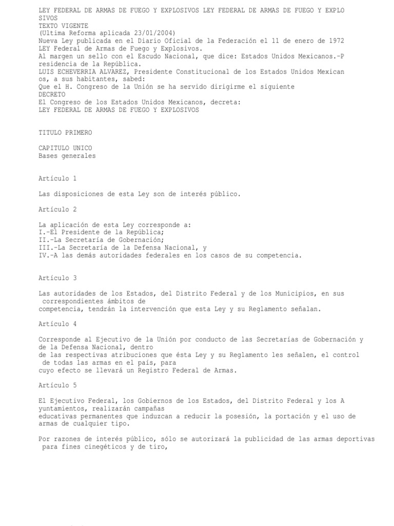 aplicada 23/01/2004) Nueva Ley publicada en el Diario Oficial de la Federacin el 11 de enero de 1972 LEY Federal de Armas de Fuego y Explosivos. Al margen un sello con el Escudo Nacional, que dice: Estados Unidos Mexicanos.-P residencia de la Repblica. LUIS ECHEVERRIA ALVAREZ, Presidente Constitucional de los Estados Unidos Mexican os, a sus habitantes, sabed: Que el H. Congreso de la Unin se ha servido dirigirme el siguiente DECRETO El Congreso de los Estados Unidos Mexicanos, decreta: LEY FEDERAL DE ARMAS DE FUEGO Y EXPLOSIVOS TITULO PRIMERO CAPITULO UNICO Bases generales Artculo 1 Las disposiciones de esta Ley son de inters pblico. Artculo 2 La aplicacin de esta Ley corresponde a: I.-El Presidente de la Repblica; II.-La Secretara de Gobernacin; III.-La Secretara de la Defensa Nacional, y IV.-A las dems autoridades federales en los casos de su competencia. Artculo 3 Las autoridades de los Estados, del Distrito Federal y de los Municipios, en sus correspondientes mbitos de competencia, tendrn la intervencin que esta Ley y su Reglamento sealan. Artculo 4 Corresponde al Ejecutivo de la Unin por conducto de las Secretaras de Gobernacin y de la Defensa Nacional, dentro de las respectivas atribuciones que sta Ley y su Reglamento les sealen, el control de todas las armas en el pas, para cuyo efecto se llevar un Registro Federal de Armas. Artculo 5 El Ejecutivo Federal, los Gobiernos de los Estados, del Distrito Federal y los A yuntamientos, realizarn campaas educativas permanentes que induzcan a reducir la posesin, la portacin y el uso de armas de cualquier tipo. Por razones de inters pblico, slo se autorizar la publicidad de las armas deportivas para fines cinegticos y de tiro,