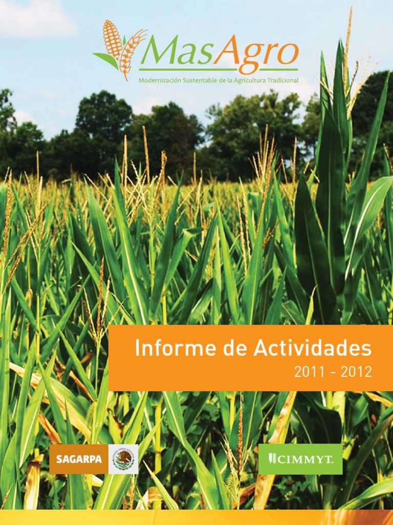 Plataformas experimentales MasAgro 1 Plataformas experimentales INIFAP MasAgro Mdulos demostrativos MasAgro 6 Mdulos demostrativos PROMAF MasAgro Tcnicos certicados en agricultura de conservacin Aspirantes a tcnico certicado en agricultura de conservacin 20 Experimentos de fertilidad integral 15 Talleres para PSP de PROMAF Colaboradores Comisin Estatal de Sanidad Vegetal, INIFAP, FIRCO, FIRA, Fundacin Produce, compaas semilleras y asociaciones de productores. Observaciones: En 2012 se comenz a promover el uso del sensor GreenSeeker a nivel comercial.