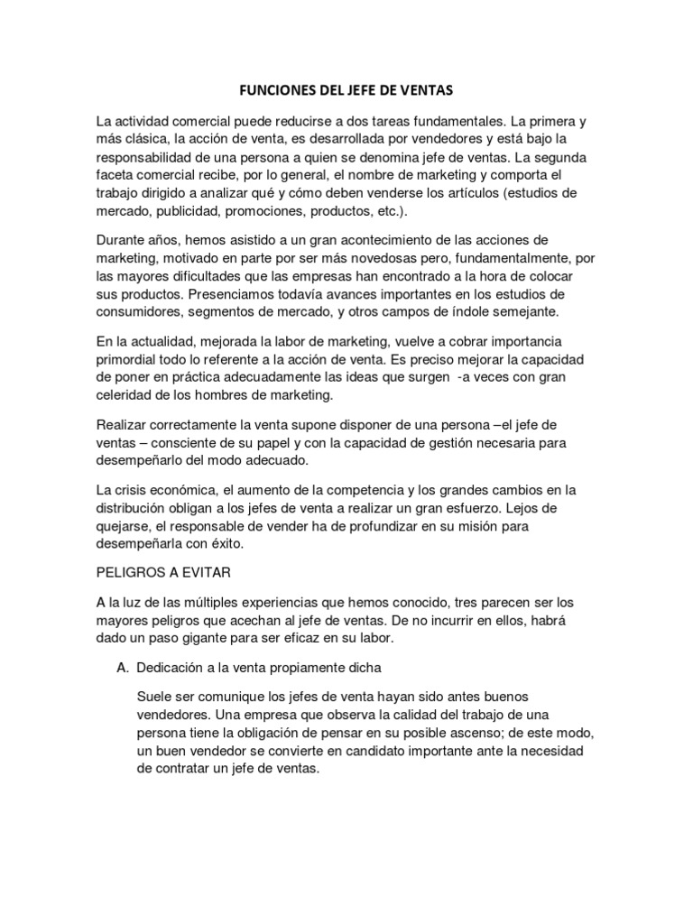 La actividad comercial puede reducirse a dos tareas fundamentales. La primera y ms clsica, la accin de venta, es desarrollada por vendedores y est bajo la responsabilidad de una persona a quien se denomina jefe de ventas. La segunda faceta comercial recibe, por lo general, el nombre de marketing y comporta el trabajo dirigido a analizar qu y cmo deben venderse los artculos (estudios de mercado, publicidad, promociones, productos, etc.). Durante aos, hemos asistido a un gran acontecimiento de las acciones de marketing, motivado en parte por ser ms novedosas pero, fundamentalmente, por las mayores dificultades que las empresas han encontrado a la hora de colocar sus productos. Presenciamos todava avances importantes en los estudios de consumidores, segmentos de mercado, y otros campos de ndole semejante. En la actualidad, mejorada la labor de marketing, vuelve a cobrar importancia primordial todo lo referente a la accin de venta. Es preciso mejorar la capacidad de poner en prctica adecuadamente las ideas que surgen -a veces con gran celeridad de los hombres de marketing. Realizar correctamente la venta supone disponer de una persona el jefe de ventas consciente de su papel y con la capacidad de gestin necesaria para desempearlo del modo adecuado. La crisis econmica, el aumento de la competencia y los grandes cambios en la distribucin obligan a los jefes de venta a realizar un gran esfuerzo. Lejos de quejarse, el responsable de vender ha de profundizar en su misin para desempearla con xito. PELIGROS A EVITAR A la luz de las mltiples experiencias que hemos conocido, tres parecen ser los mayores peligros que acechan al jefe de ventas. De no incurrir en ellos, habr dado un paso gigante para ser eficaz en su labor. A. Dedicacin a la venta propiamente dicha Suele ser comunique los jefes de venta hayan sido antes buenos vendedores. Una empresa que observa la calidad del trabajo de una persona tiene la obligacin de pensar en su posible ascenso; de este modo, un buen vendedor se convierte en candidato importante ante la necesidad de contratar un jefe de ventas.