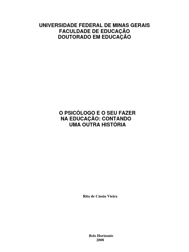 VIEIRA, Rita de Cssia. O psiclogo e o seu fazer na Educao: contando uma outra histria. Tese de Doutoramento (Educao). Universidade Federal de Minas Gerais, Faculdade de Educao, Belo Horizonte, 2008. RESUMO