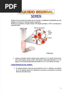 El volumen promedio de semen de una eyaculacin es de 1,5 a 5 mililitros, con mximo de 15 [Link] mucho de la abstinencia sexual previa y del nivel de excitacin durante la actividad sexual. El cuerpo humano elimina peridicamente el semen almacenado. Si no se eyacula durante un tiempo, se suelen producir poluciones nocturnas. El color del semen es normalmente blancuzco o blanco lechoso o levemente amarillento, por las flavinas provenientes de la vescula seminal. Si el lquido eyaculado presenta un color anaranjado o rojizo, es posible que contenga sangre, signo que se conoce como hematospermia, que puede indicar un trastorno urolgico. El semen suele tener una consistencia de cogulo, debido a la facilidad de solidificacin que posee gracias al fosfato de espermina y otras protenas similares al fibringeno. Es frecuente la aparicin de grumos ms slidos, pero ello no es indicativo de ninguna clase de problemas. El olor es peculiar y variable en cada individuo, en funcin de mltiples factores. Se trata de caractersticas que incluyen un fuerte componente subjetivo y emocional. Para unas personas es desagradable y para otras es excitante. Algunas personas reconocen un leve sabor dulce y afrutado, debido a las protenas alcalinas. El aroma puede ser muy intenso.