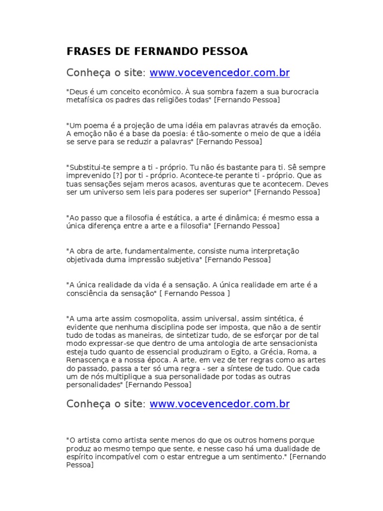 "Deus um conceito econmico. sua sombra fazem a sua burocracia metafsica os padres das religies todas" [Fernando Pessoa] "Um poema a projeo de uma idia em palavras atravs da emoo. A emoo no a base da poesia: to-somente o meio de que a idia se serve para se reduzir a palavras" [Fernando Pessoa] "Substitui-te sempre a ti - prprio. Tu no s bastante para ti. S sempre imprevenido [?] por ti - prprio. Acontece-te perante ti - prprio. Que as tuas sensaes sejam meros acasos, aventuras que te acontecem. Deves ser um universo sem leis para poderes ser superior" [Fernando Pessoa] "Ao passo que a filosofia esttica, a arte dinmica; mesmo essa a nica diferena entre a arte e a filosofia" [Fernando Pessoa] "A obra de arte, fundamentalmente, consiste numa interpretao objetivada duma impresso subjetiva" [Fernando Pessoa] "A nica realidade da vida a sensao. A nica realidade em arte a conscincia da sensao" [ Fernando Pessoa ] "A uma arte assim cosmopolita, assim universal, assim sinttica, evidente que nenhuma disciplina pode ser imposta, que no a de sentir tudo de todas as maneiras, de sintetizar tudo, de se esforar por de tal modo expressar-se que dentro de uma antologia de arte sensacionista esteja tudo quanto de essencial produziram o Egito, a Grcia, Roma, a Renascena e a nossa poca. A arte, em vez de ter regras como as artes do passado, passa a ter s uma regra - ser a sntese de tudo. Que cada um de ns multiplique a sua personalidade por todas as outras personalidades" [Fernando Pessoa]