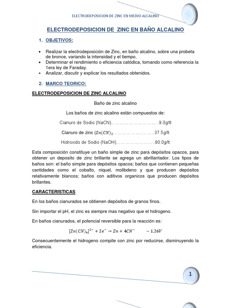 1. OBJETIVOS: Realizar la electrodeposicin de Zinc, en bao alcalino, sobre una probeta de bronce, variando la intensidad y el tiempo. Determinar el rendimiento o eficiencia catdica, tomando como referencia la 1era ley de Faraday. Analizar, discutir y explicar los resultados obtenidos.