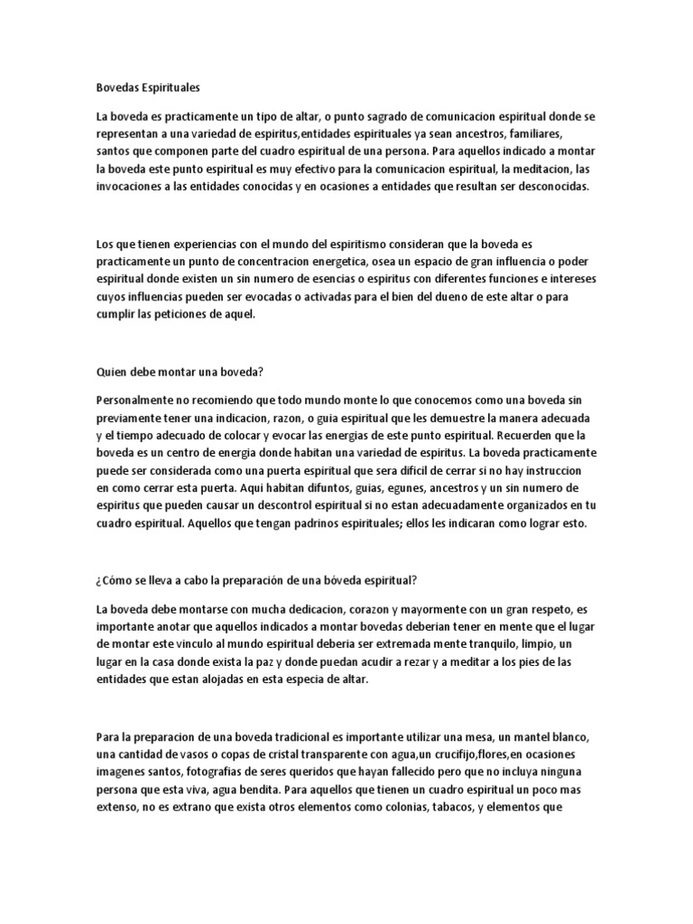 Cmo se lleva a cabo la preparacin de una bveda espiritual? La boveda debe montarse con mucha dedicacion, corazon y mayormente con un gran respeto, es importante anotar que aquellos indicados a montar bovedas deberian tener en mente que el lugar de montar este vinculo al mundo espiritual deberia ser extremada mente tranquilo, limpio, un lugar en la casa donde exista la paz y donde puedan acudir a rezar y a meditar a los pies de las entidades que estan alojadas en esta especia de altar.