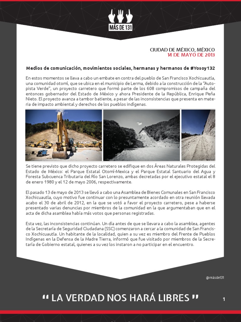 Estado de México: el Parque Estatal Otomí-Mexica y el Parque Estatal Santuario del Agua y Foresta Subcuenca Tributaria del Río San Lorenzo, ambas decretadas por el ejecutivo estatal el 8 de enero 1980 y el 12 de mayo 2006, respectivamente. El pasado 13 de mayo de 2013 se llevó a cabo una Asamblea de Bienes Comunales en San Francisco Xochicuautla, cuyo motivo fue continuar con lo presuntamente acordado en otra reunión llevada acabo el 30 de abril de 2012, en la que se votó a favor el proyecto carretero, pese a haberse presentado varias denuncias por miembros de la comunidad en la que argumentaban que en el acta de dicha asamblea había más votos que personas registradas. Esta vez, las inconsistencias continúan. Un día antes de que se llevara a cabo la asamblea, agentes de la Secretaría de Seguridad Ciudadana (SSC) comenzaron a cercar a la comunidad de San Francis-co Xochicuautla. Un habitante de la localidad, quien a su vez es miembro del Frente de Pueblos Indígenas en la Defensa de la Madre Tierra, informó que fue visitado por miembros de la Secre-taría de Gobierno estatal, quienes a su vez los instaron a no participar en el encuentro.