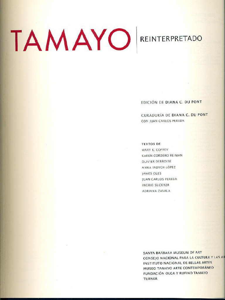 ron de 'uma impOl1ancia para SU visin de (o pintura rigurati"a moderoa, Sin embargo, hobra crticas encontrad., on el sentido de que era demasiado europoo -un francfjlQ de cordzn que perpetuooa el coloni.li,mo_ 0, por 01col1tl'ario, demosiedo mexicano -uro autn" tico "'pan,nt. oiela imagen extica de Mf,ico--, " '" ',"pli,a e"l(mees por qu, para algllno" fue y no dej de 'er un problemtico)' Tamayo perteneci .Ia hwela Mexicanu, ,_entonce, por qu la relacin con sus principale, miembros -OroZO, Rivera y en especial Siqueiros_ " convirti en Uf! de'pi8dado ,taque persoml? "[""mayo fue nn importent, COmO sus culosa, en la conformacin Je l. E,cuela Mexic,na l' tambin fue "nsible o los lecdon., del orte moJerno oUI'apeo, <"ton,e, por qu olguno, Je 'u, mmpaUioos lo criicoron y cc'lparon d, traiJor a la potria y a la RevollJcion? i_Porqu l, " su vez, aCIJs6 a River., Orozco i Siqueiros de xenfobos y de frellor el de>arrollo d~ la pintu" m"kana Con su rcinlerpr"tocjn del naoioll"lisnlO ?~; Si ,e opuso al nacionali,mo, y ,in embJl'go luego "rJopt estratogias naciun,liSla' para Crear una m,eva formo de pi"tura figurativo, par qu sostu'.'O'" compromiso con el I"ali,mo p~ro nuneo ,c'miti que era abstracto? Eldeoenmaraar ""as complejidades y contradicciones ayuda a ,"reodor por qu Tamoyo fue, a un tiempo, tan exitoso, COntrovertido}' ,ignificotivo p"'a la historia del arto moderno mexicano,